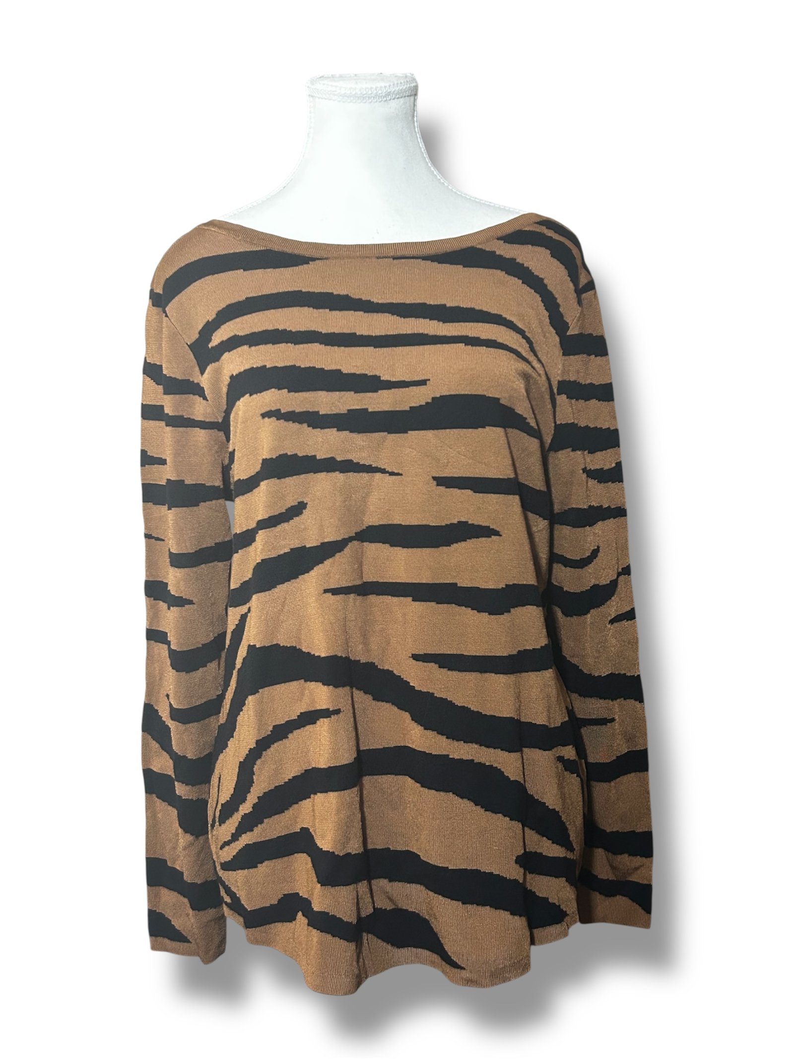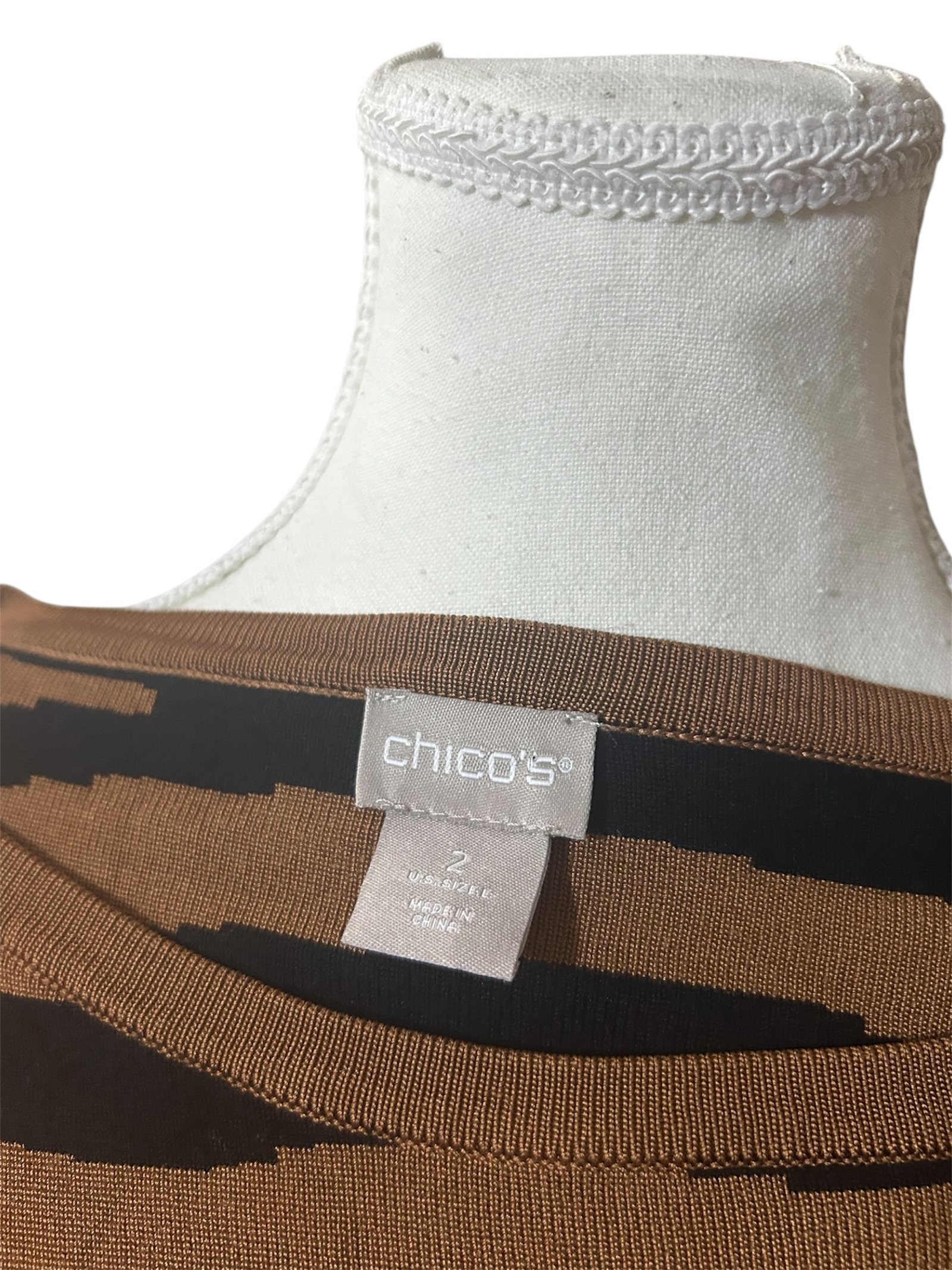 Elegante y llamativa blusa de la marca Chico’s en talla 2 (equivalente a M/L), perfecta para quienes buscan una prenda con personalidad pero versátil.
