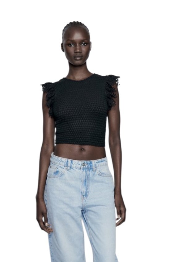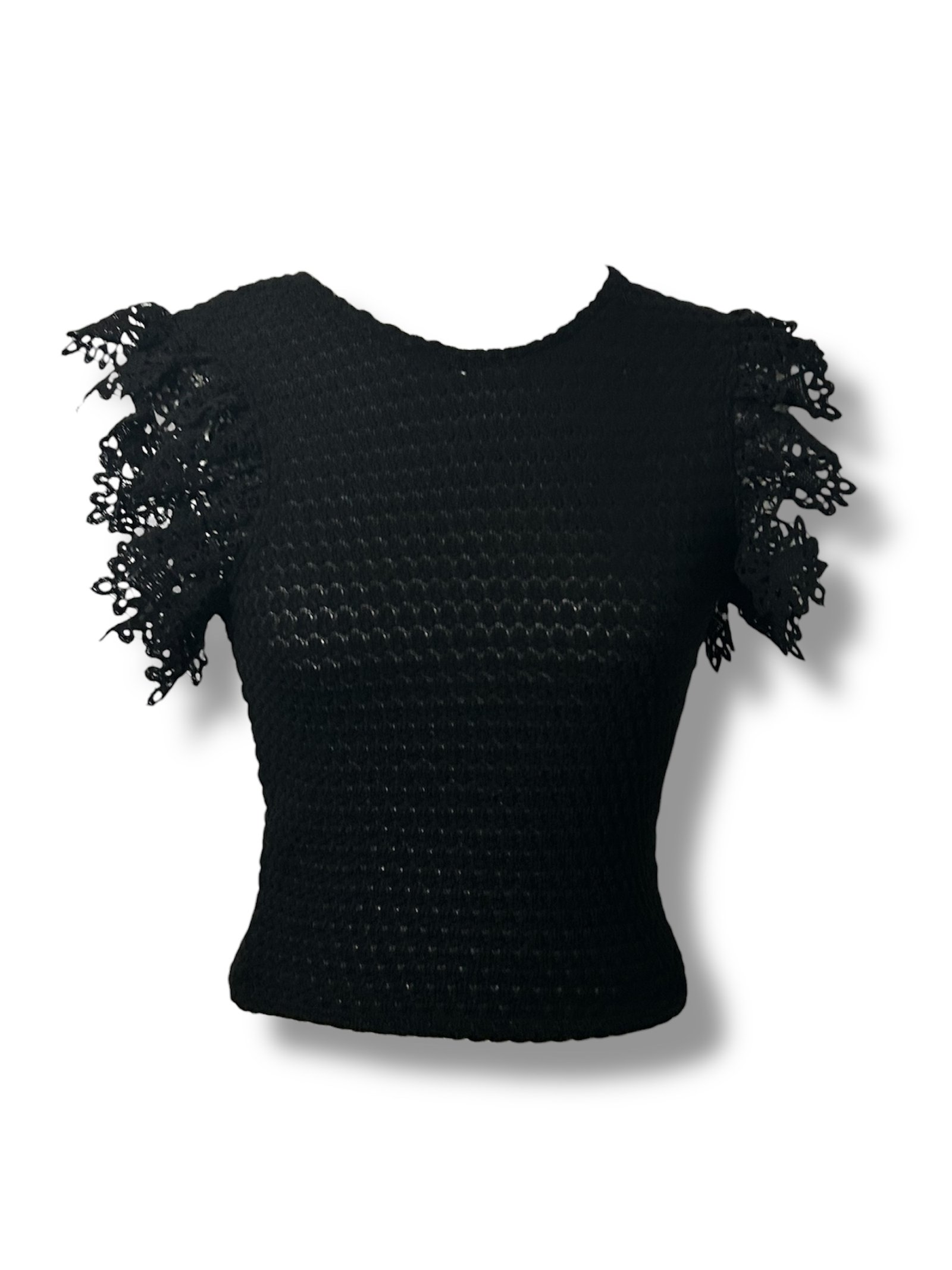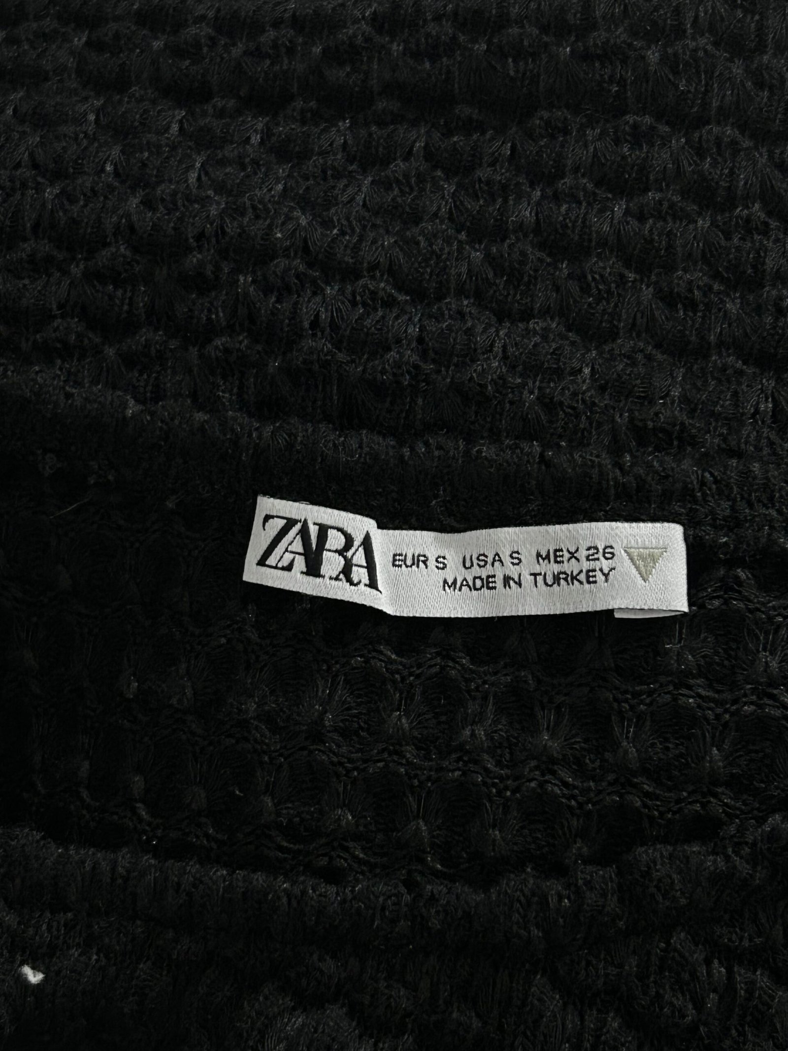 Hermosa blusa de la marca Zara en talla S, elaborada en tejido tipo crochet de color negro que aporta textura y un estilo elegante y moderno. Su diseño destaca por las delicadas mangas cortas con detalles de encaje que añaden un toque romántico y femenino.