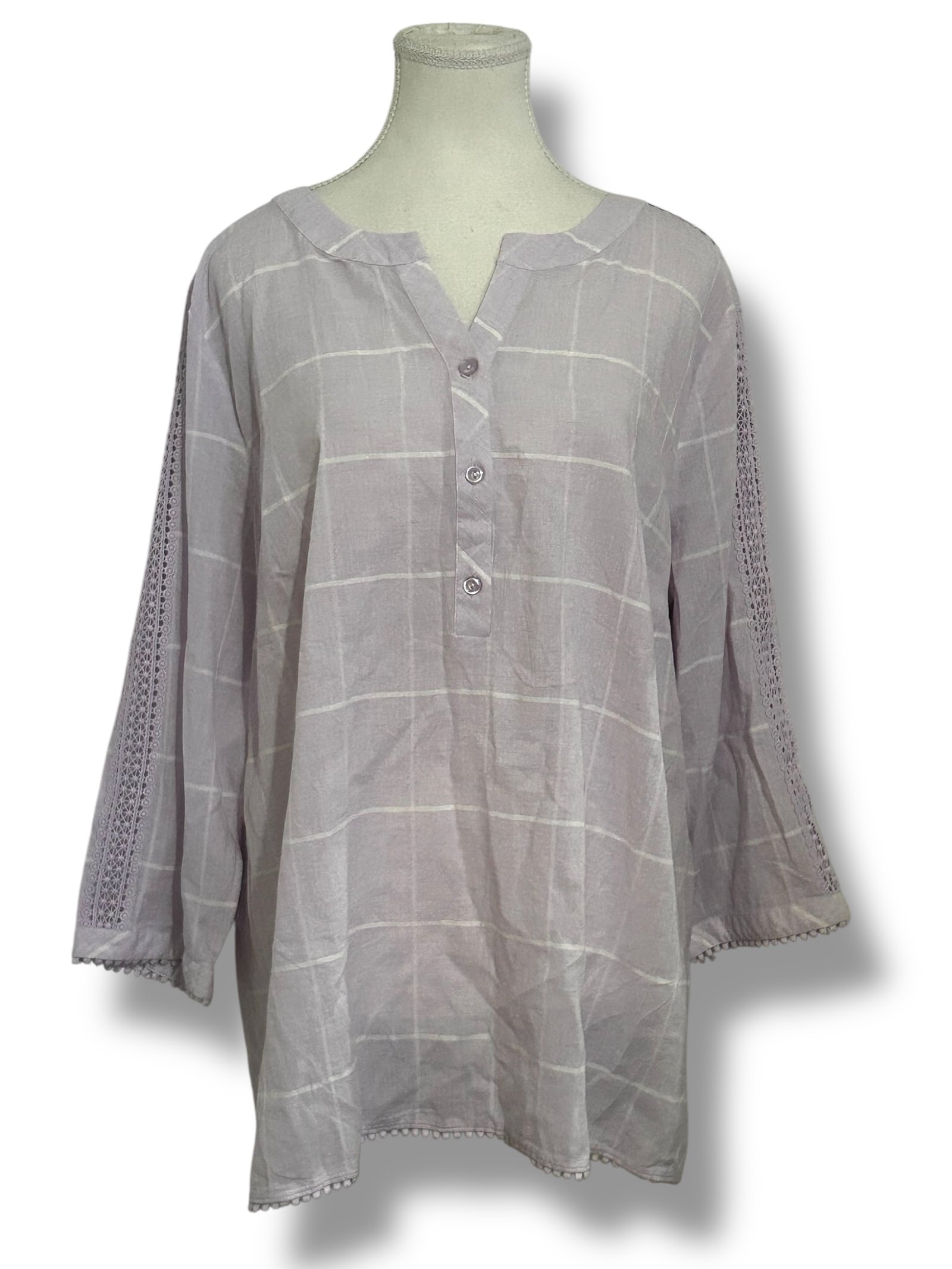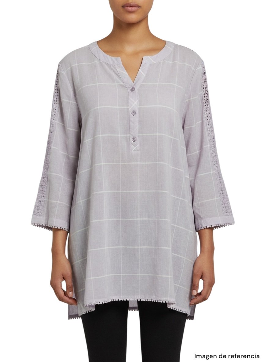 Tiene un diseño en tono lavanda pálido con líneas tipo cuadros, un color suave que aporta delicadeza y combina fácilmente.