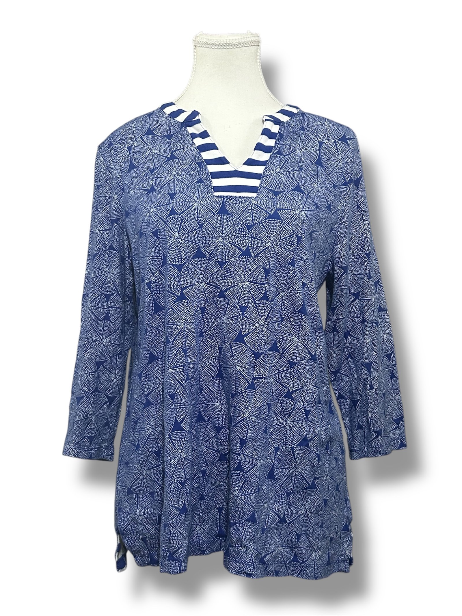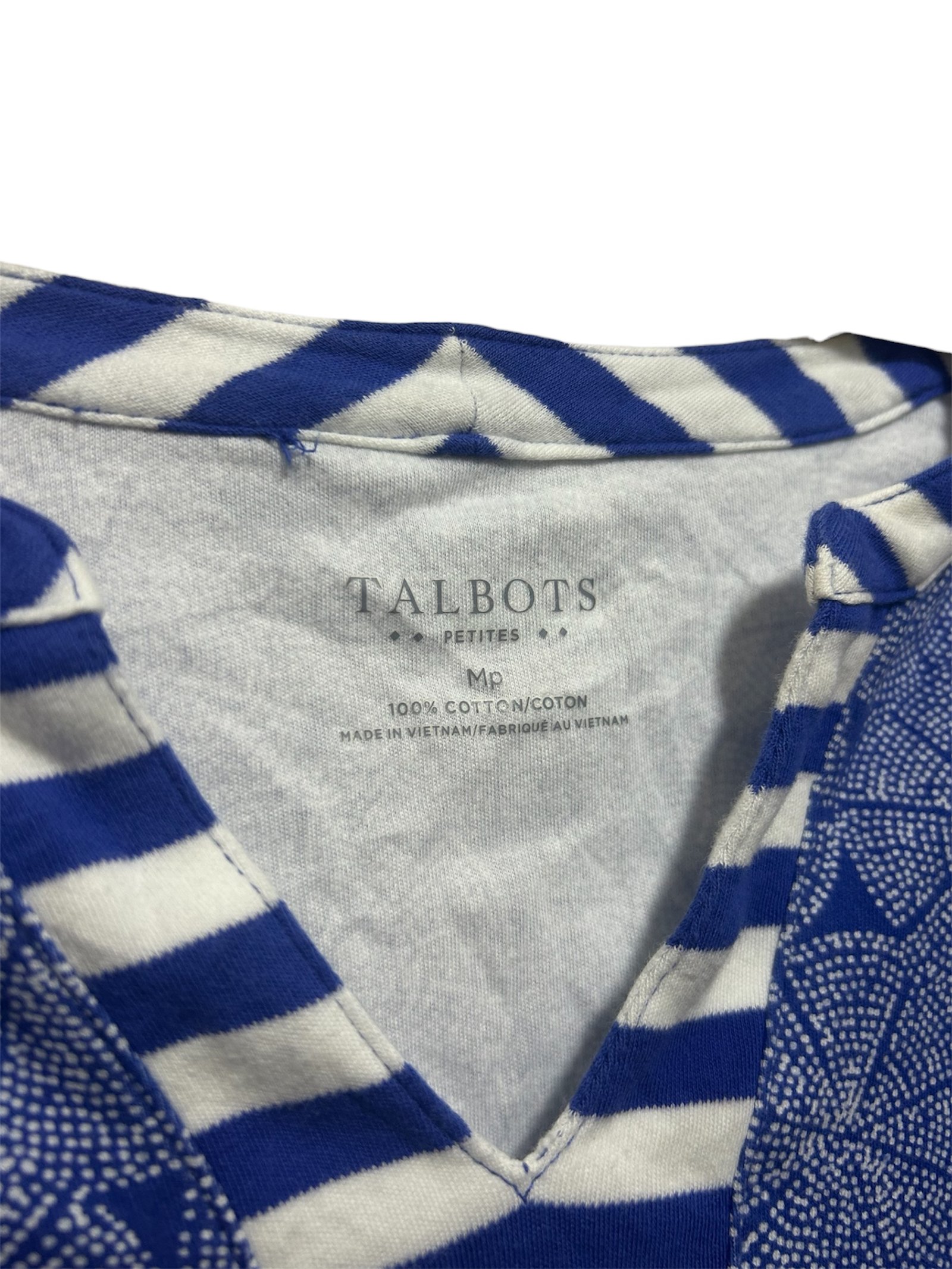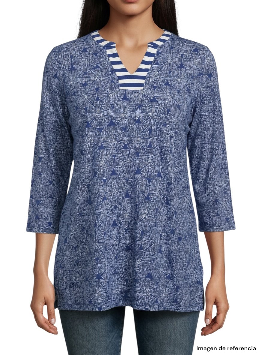 Hermosa blusa marca Talbots en talla MP (Medium Petite), diseñada con un elegante estampado en tonos azules que le da un estilo sofisticado y atemporal. Cuenta con mangas 3/4 que brindan comodidad y la hacen ideal para usar durante diferentes temporadas.