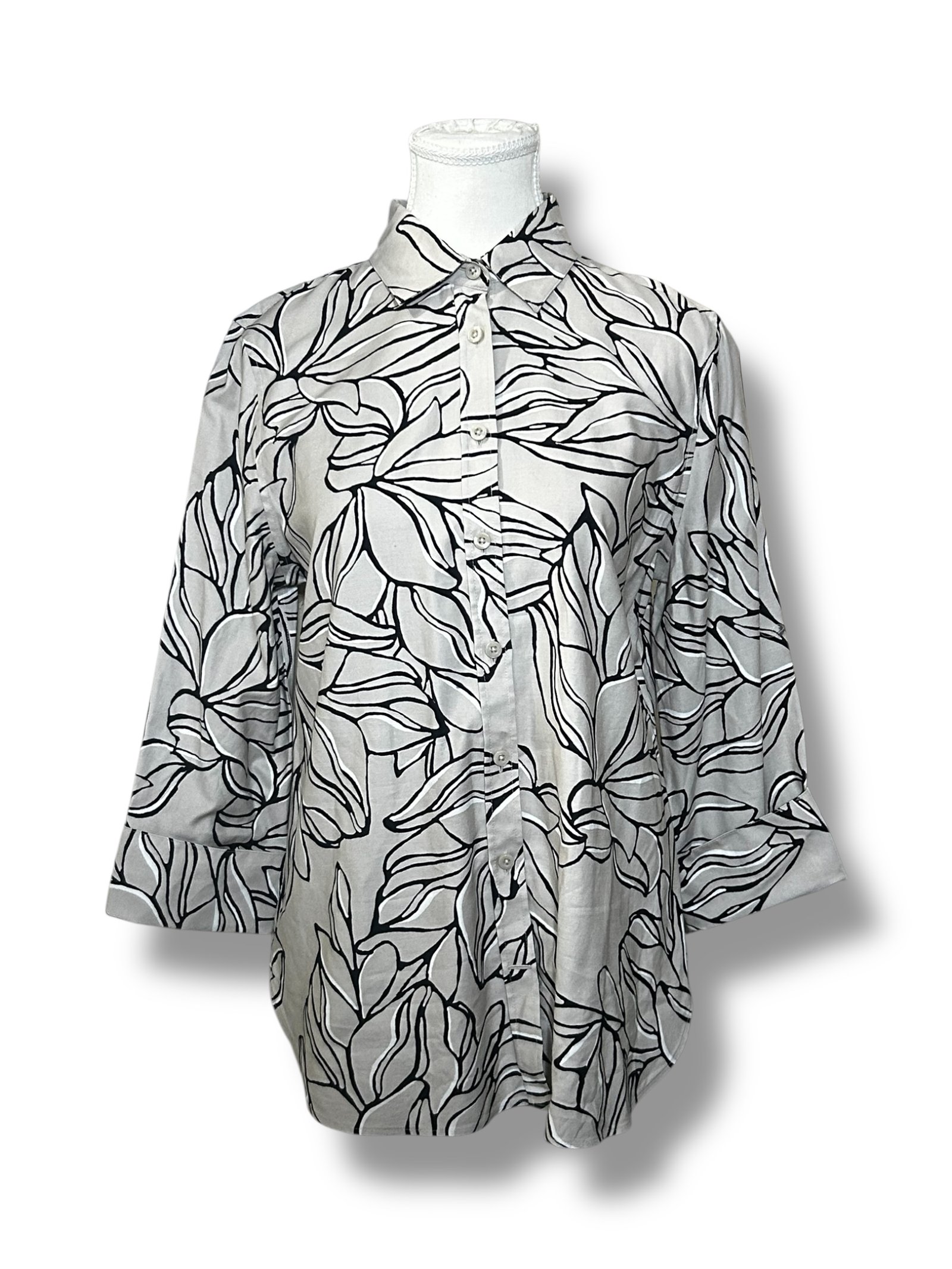 Diseñada en una base blanco/crema con estampado abstracto en negro, creando un contraste sofisticado y atemporal.