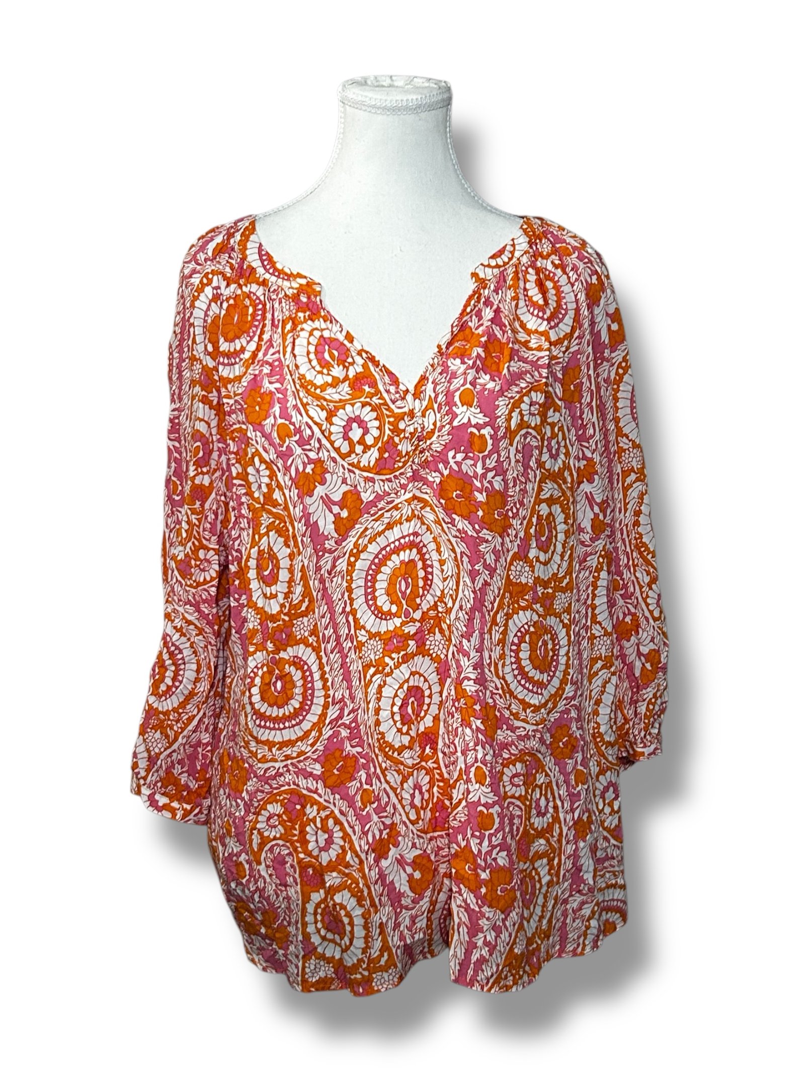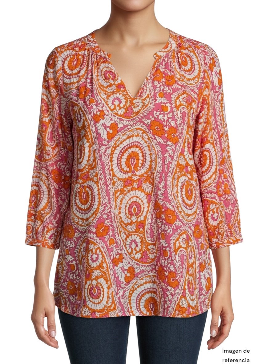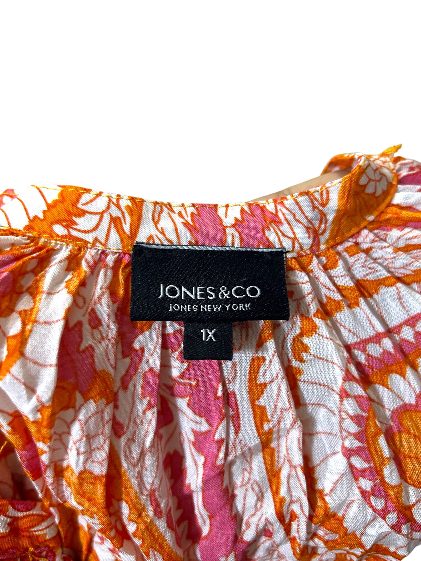 Blusa JONES & CO talla 1X con estampado vibrante en tonos naranja y rosa. Fresca, cómoda y llamativa.