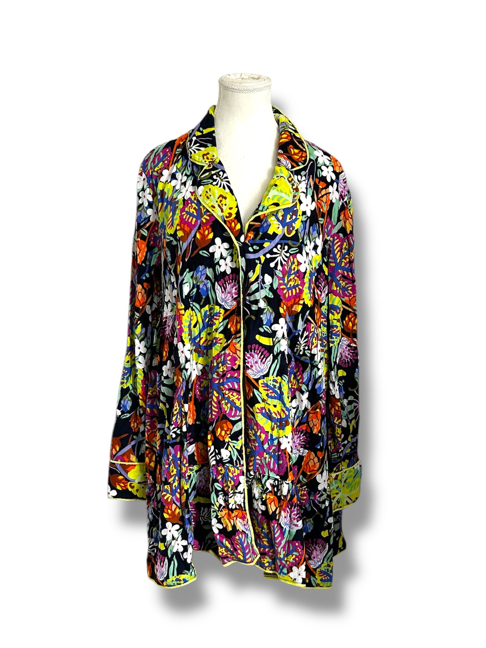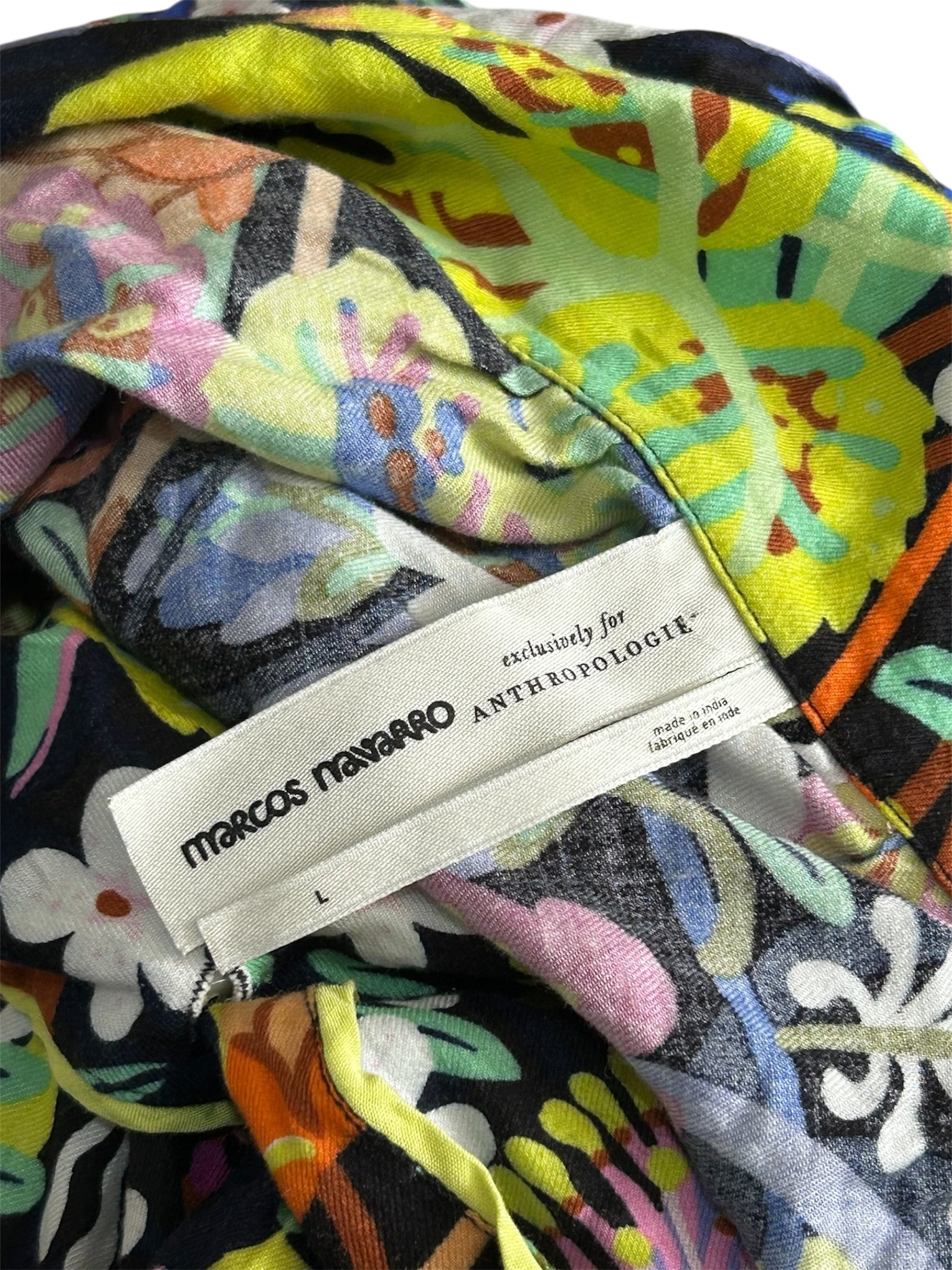 Blusa de la marca Marcas Navajo, diseñada exclusivamente para Anthropologie, en talla L, confeccionada en una tela suave y ligera que brinda una caída fluida y cómoda. Destaca por su llamativo estampado multicolor con motivos florales y abstractos en tonos vivos como amarillo, naranja, azul, verde y blanco sobre fondo oscuro, creando una pieza única y llena de personalidad.