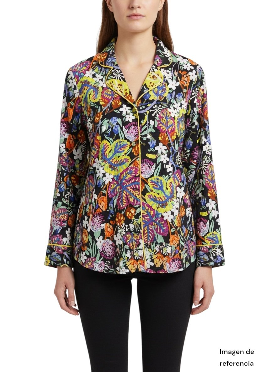 El diseño incluye cuello tipo camisa con solapa, cierre frontal con botones y mangas largas con terminaciones en puño, aportando un estilo elegante pero relajado. Su silueta es suelta, lo que la hace ideal para un look cómodo sin perder estilo.