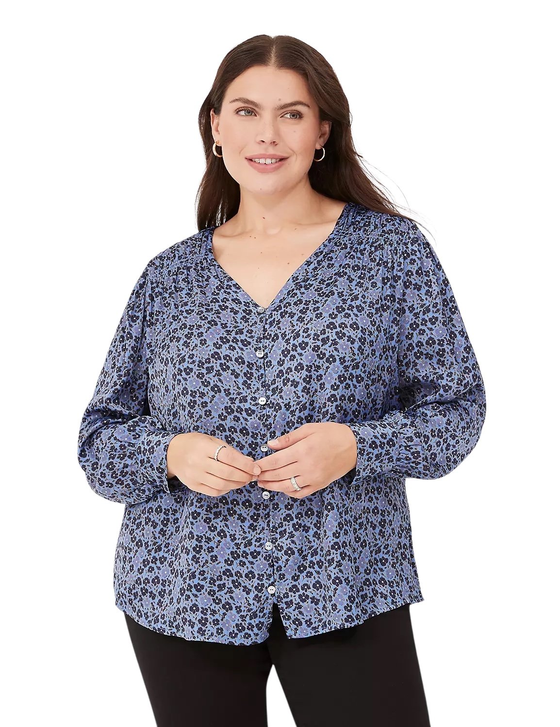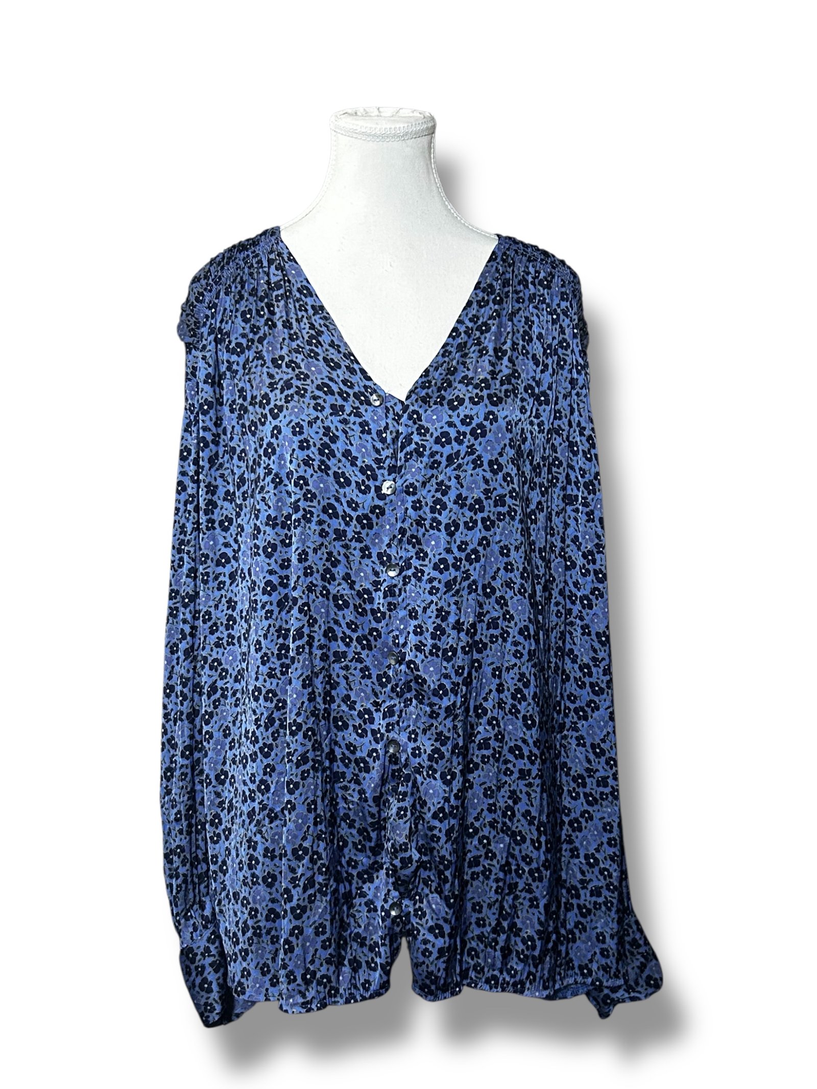 Blusa LANE BRYANT talla 26/28 con estampado floral en tonos azules. Cómoda, fresca y elegante.