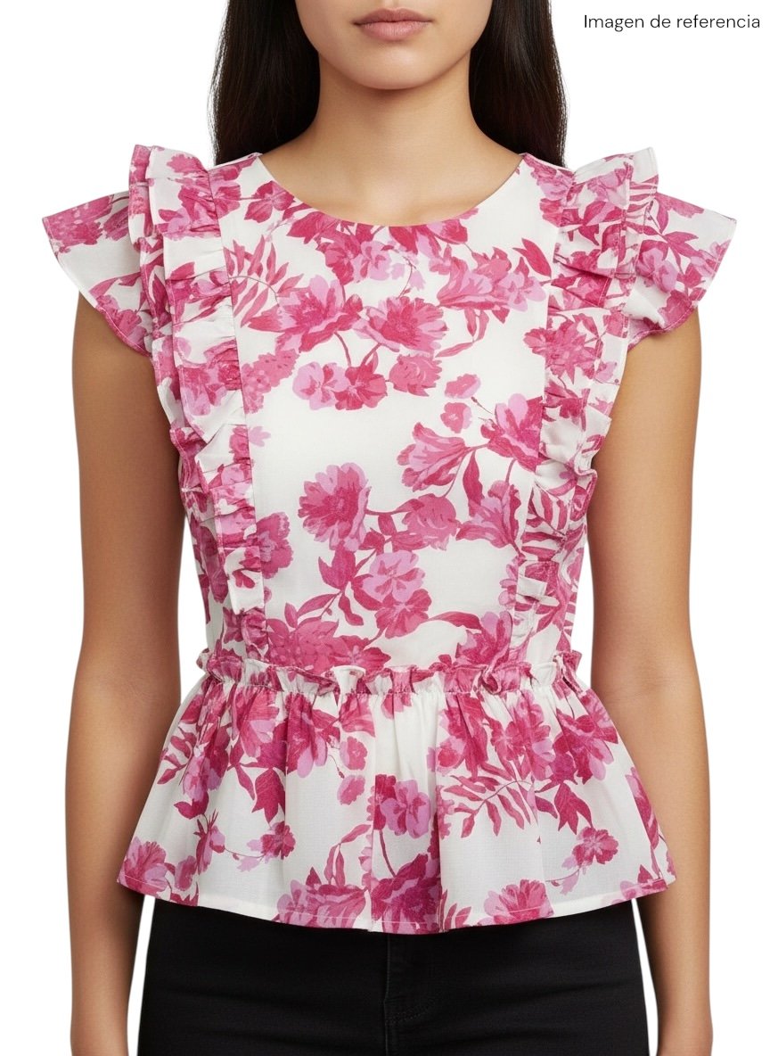 Encantadora blusa de la marca Sugar + Lips en talla S, diseñada con un hermoso estampado floral en tonos rosados sobre fondo claro que aporta un estilo romántico y muy femenino.