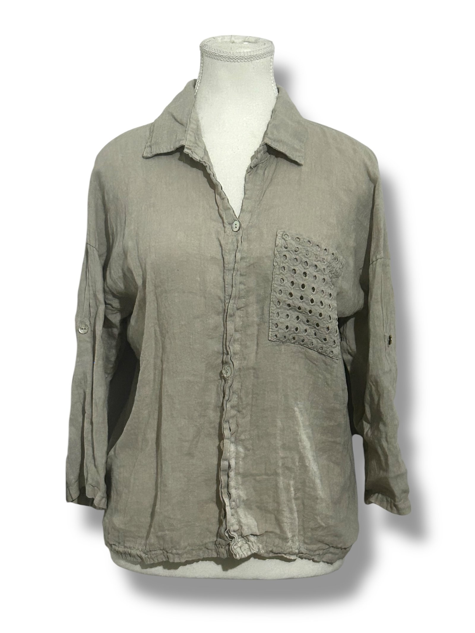 Blusa KAKTUS talla S de lino en tono natural con bolsillo bordado. Fresca, ligera y perfecta para looks relajados
