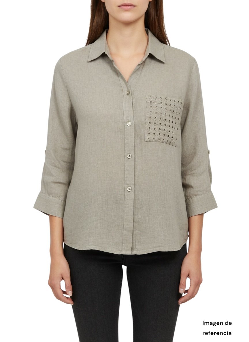 Cuenta con botones al frente, mangas ajustables y un bolsillo con detalle bordado calado, que le da un toque especial y delicado.