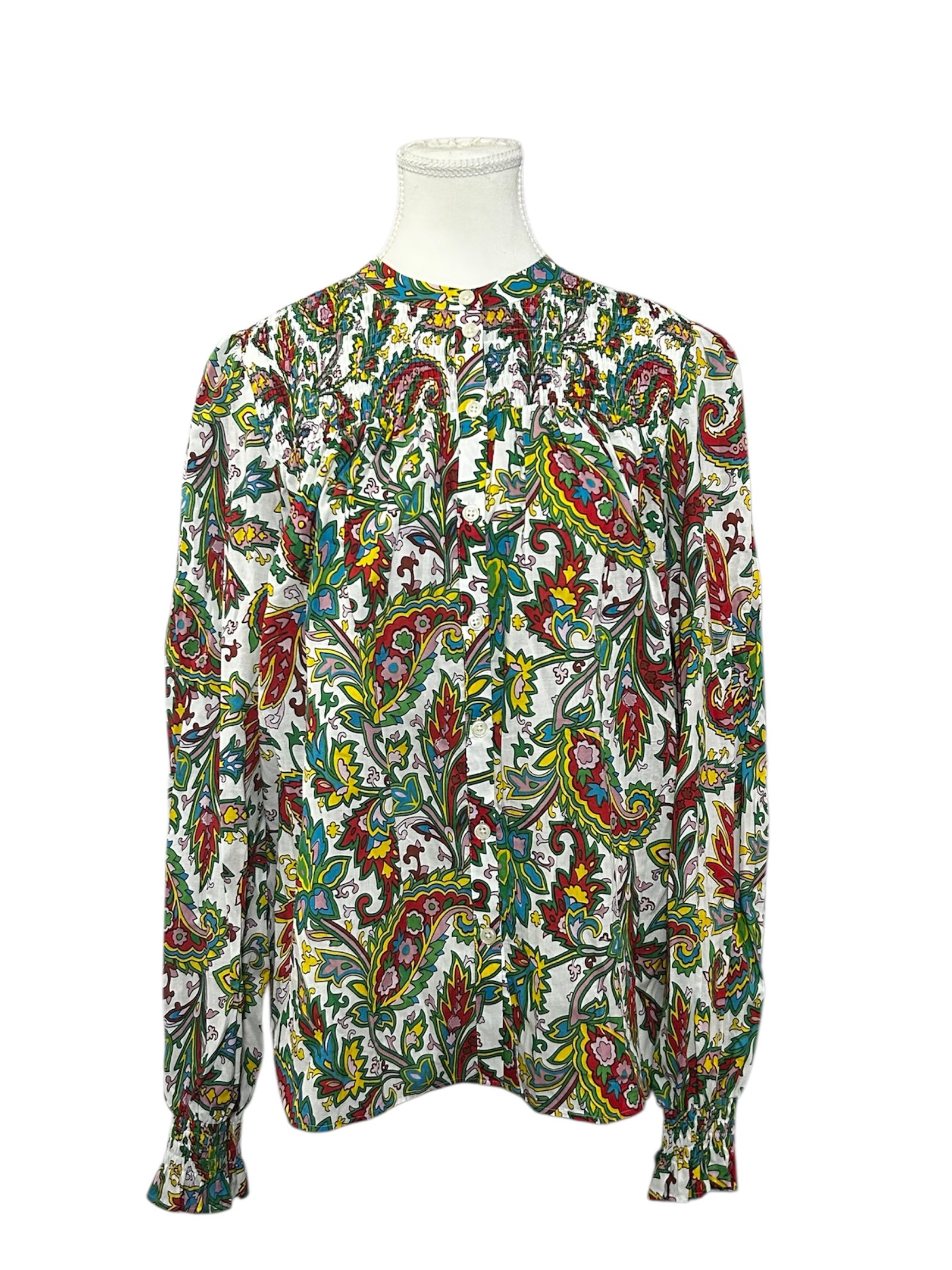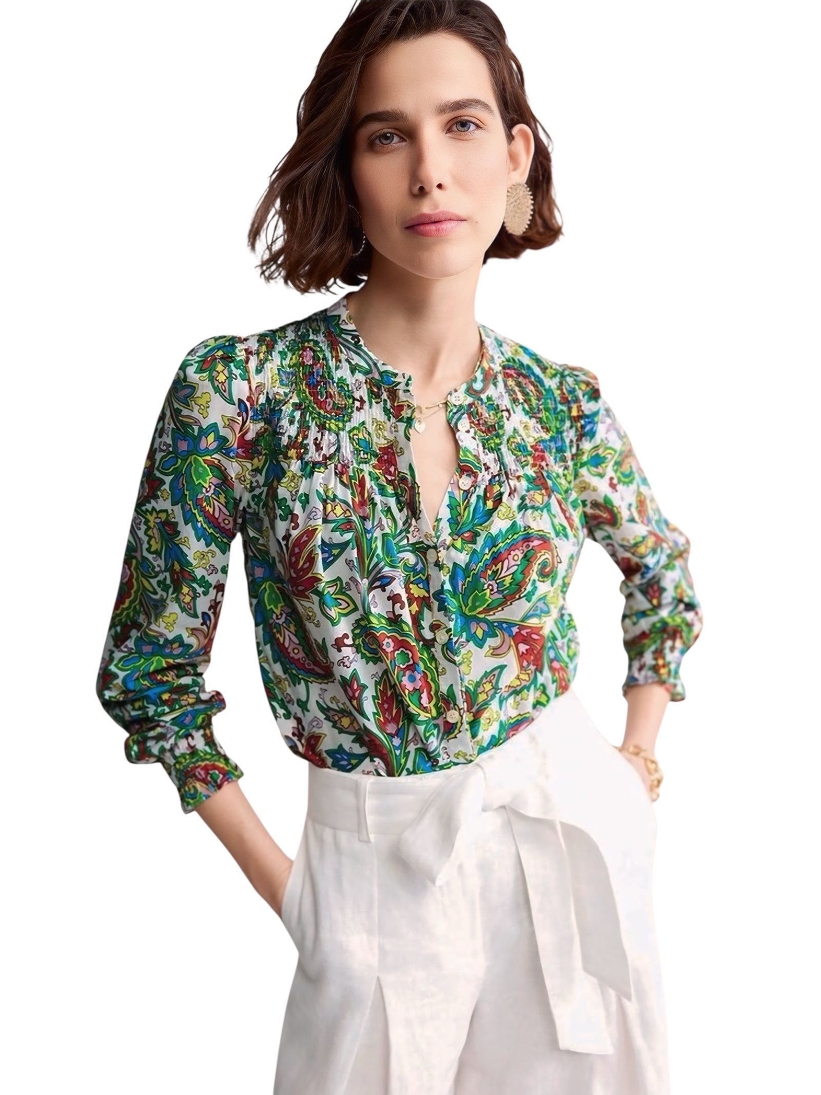 Esta pieza destaca por su vibrante estampado paisley multicolor, con una combinación de tonos verdes, rojos, amarillos y azules sobre fondo claro, que aporta un look alegre, sofisticado y lleno de vida. Su diseño de manga larga con puños elásticos añade un toque femenino y cómodo, mientras que el frente con botones y cuello sutil le da un acabado pulido y elegante.