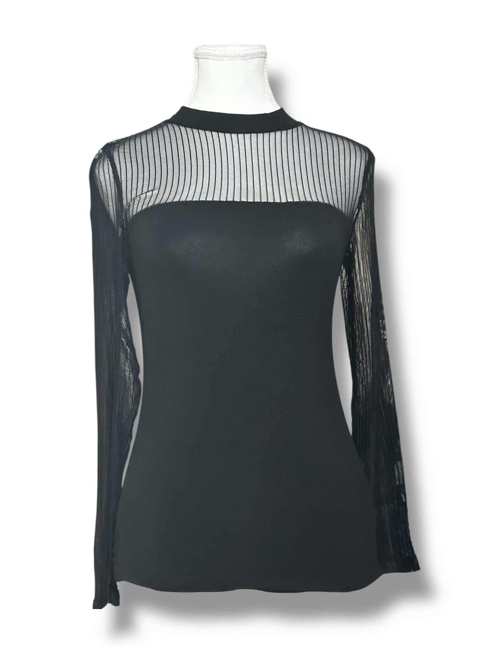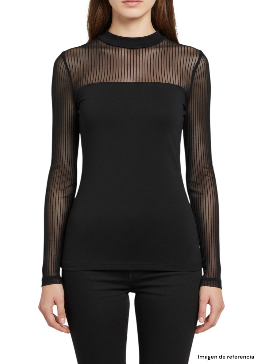 Esta prenda destaca por su juego de transparencias en la parte superior y mangas, con un delicado diseño de líneas verticales que estilizan visualmente la figura y aportan un toque sofisticado. El contraste entre la tela sólida del cuerpo y la transparencia crea un efecto visual muy favorecedor y chic.