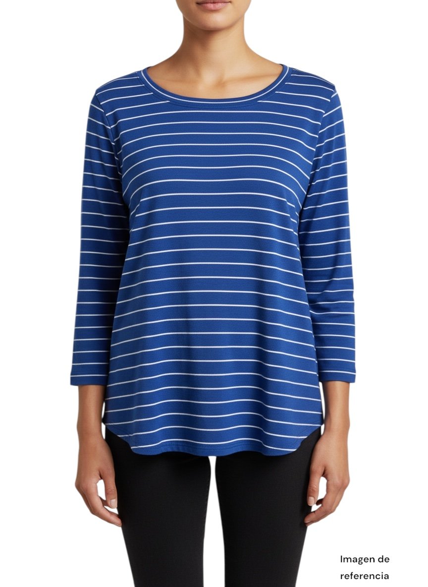 Presenta un atractivo diseño de rayas horizontales en color blanco sobre fondo azul vibrante, aportando un estilo clásico con un toque moderno. Su corte relajado y ligeramente amplio la hace perfecta para el uso diario, ofreciendo un ajuste cómodo y favorecedor para diferentes tipos de cuerpo.