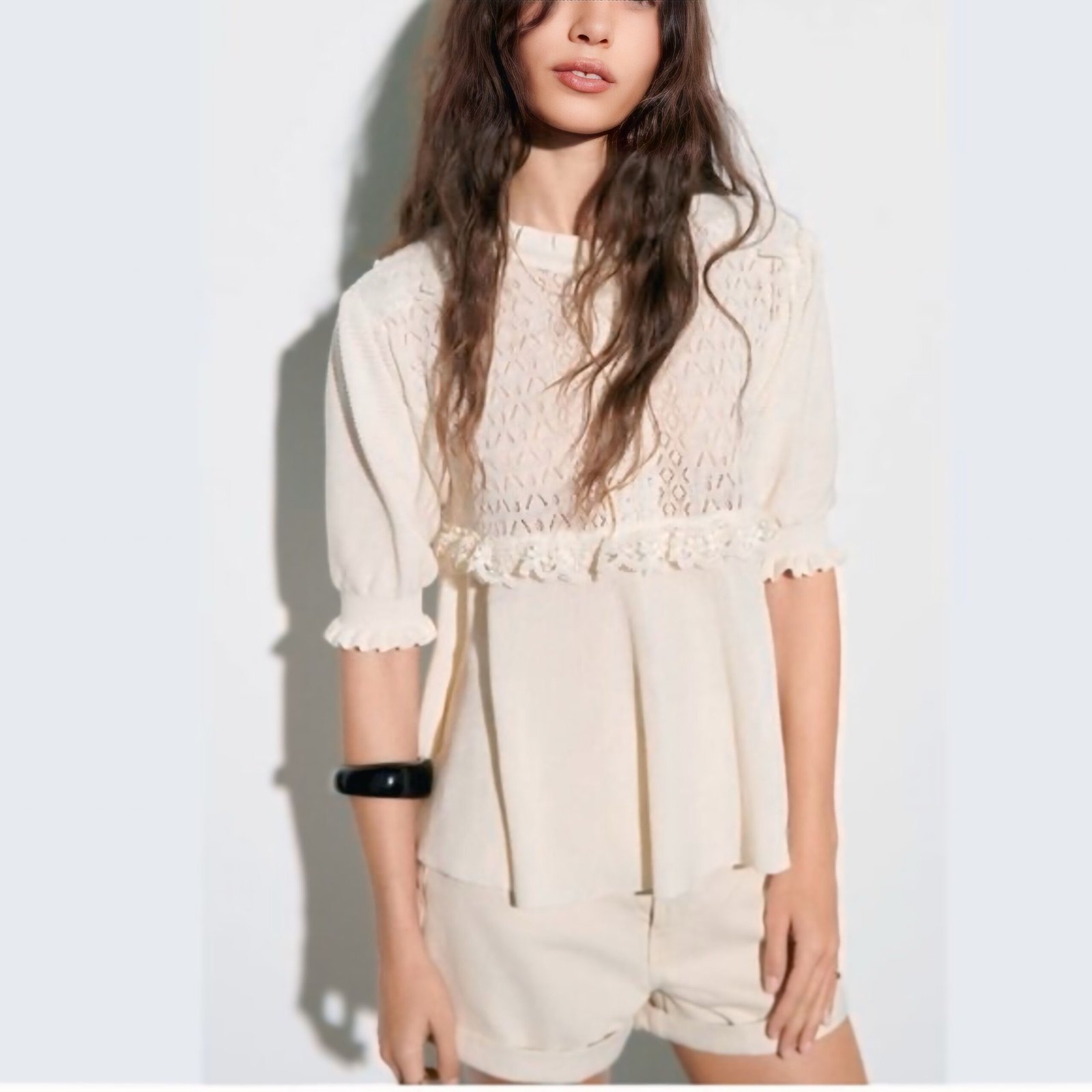 Hermosa y delicada blusa de la marca ZARA en talla S, ideal para un estilo romántico, elegante y muy femenino.