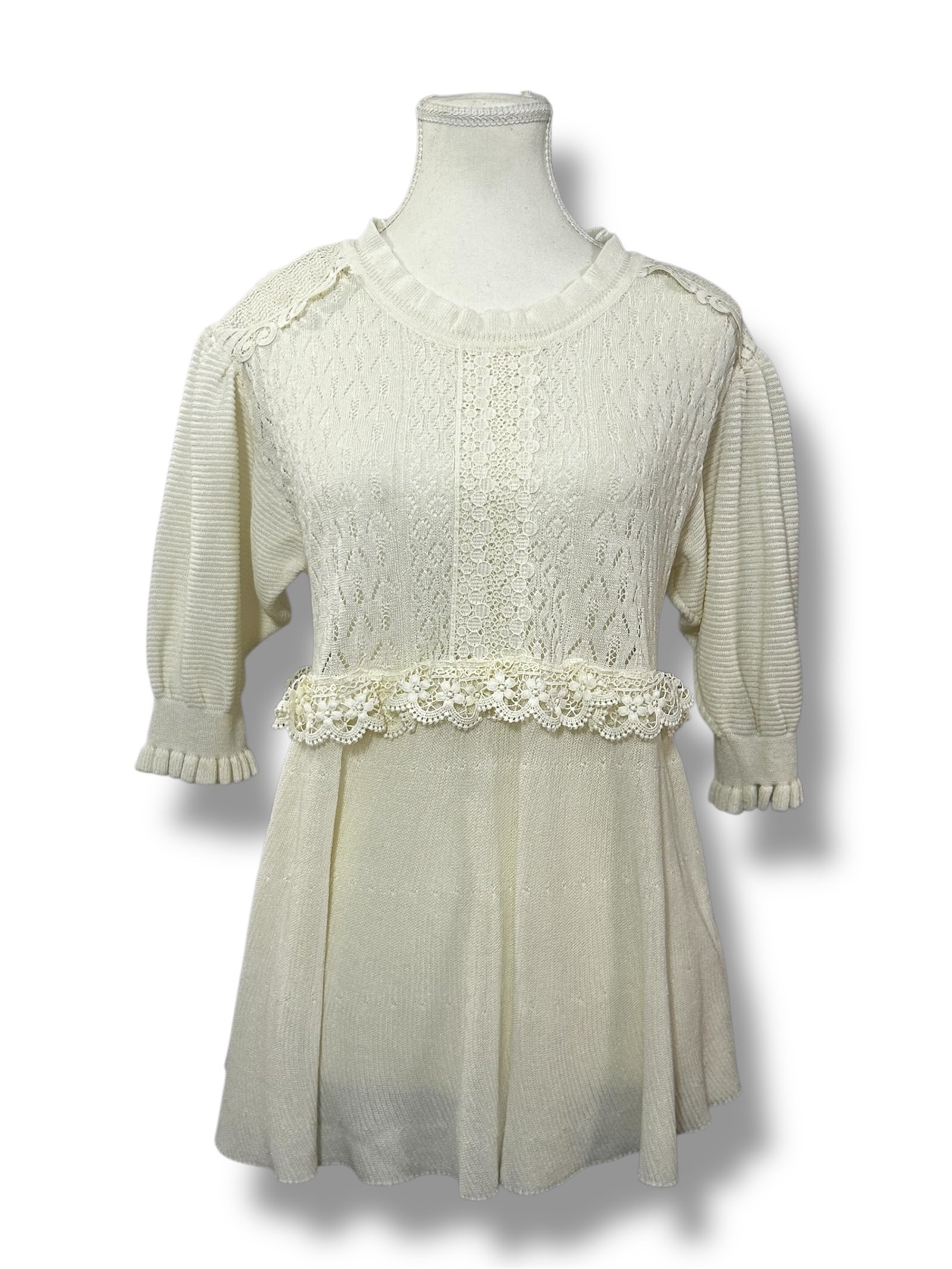 El diseño incluye detalles tejidos tipo knit en la parte superior, con patrones delicados que le dan textura y un acabado muy especial. En la zona del pecho incorpora un panel de encaje, aportando un toque aún más romántico y refinado.