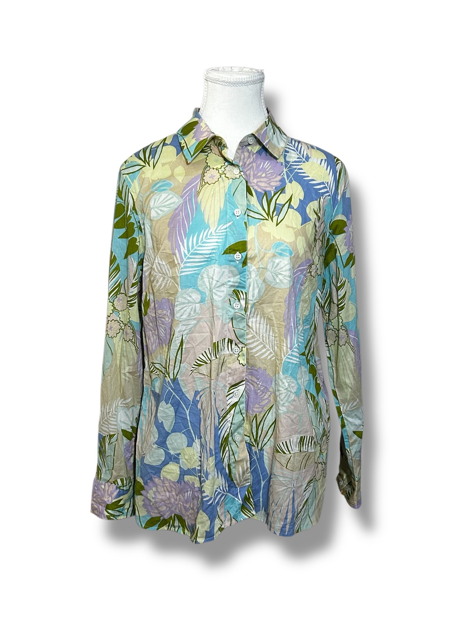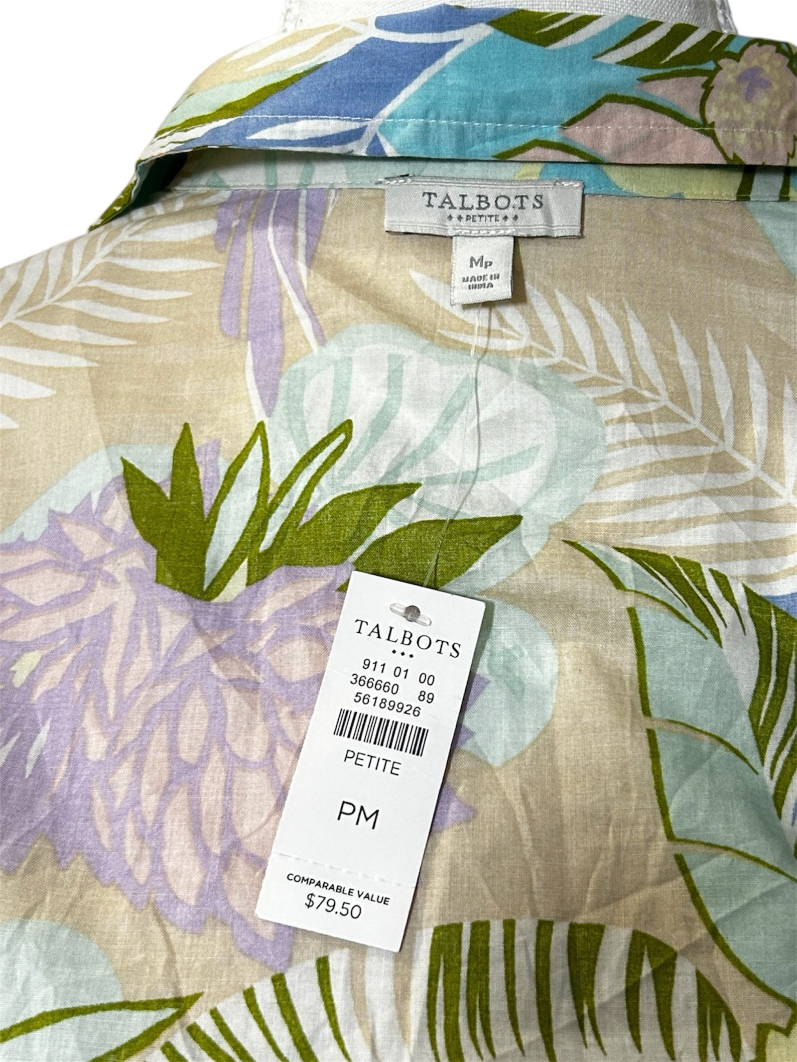 Blusa TALBOTS PETITE con estampado tropical en tonos suaves, manga larga y botones frontales. Talla M, nueva con etiqueta.