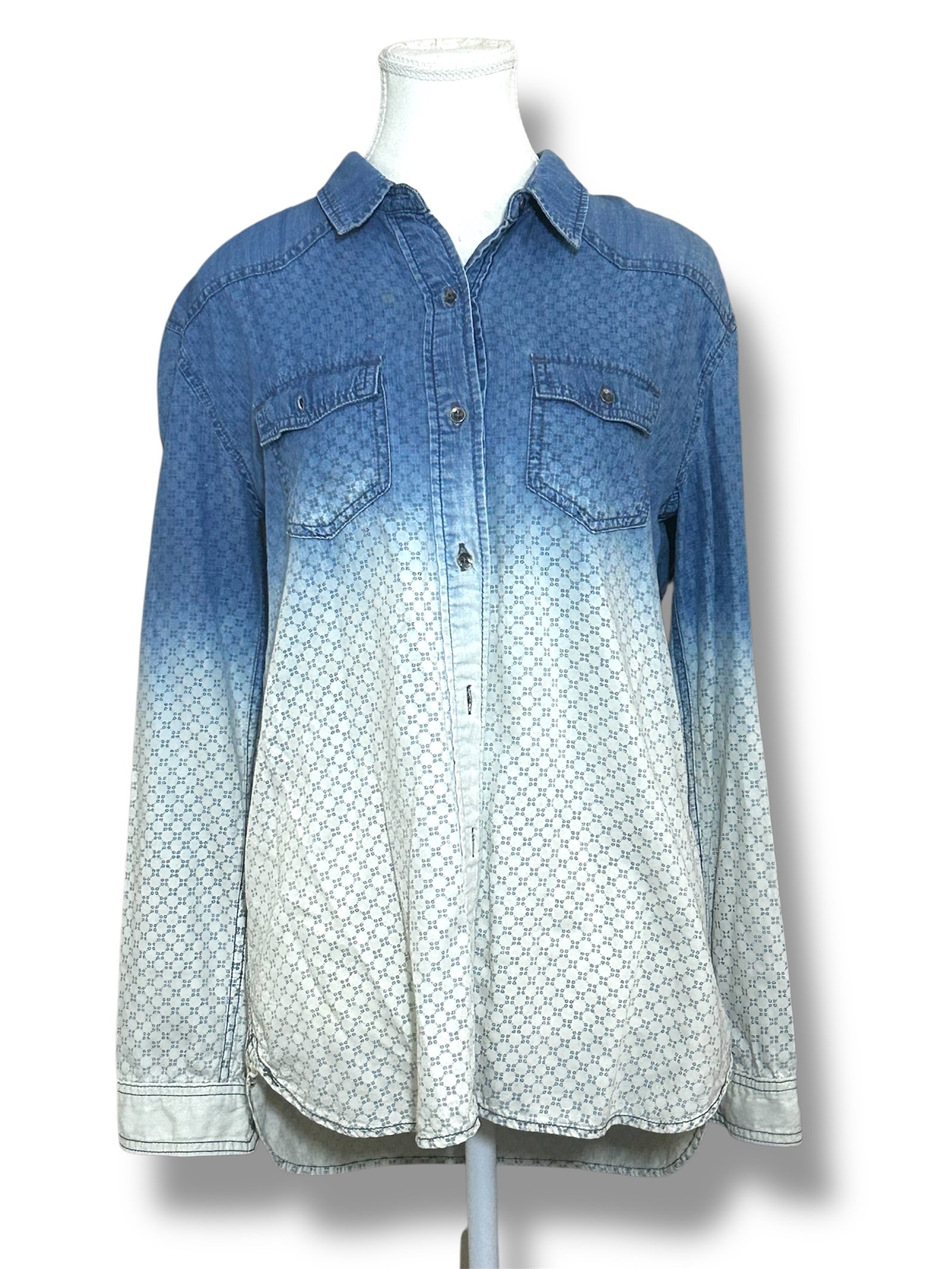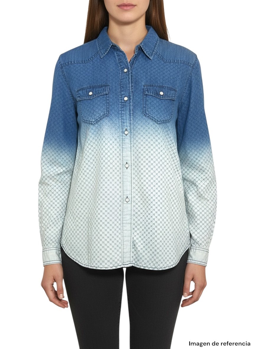 Esta prenda destaca por su original efecto degradé en denim, que combina tonos azul más oscuro en la parte superior con un acabado más claro en la parte inferior, creando un estilo único y llamativo. Además, cuenta con un sutil patrón estampado en la parte inferior que le da un detalle especial.