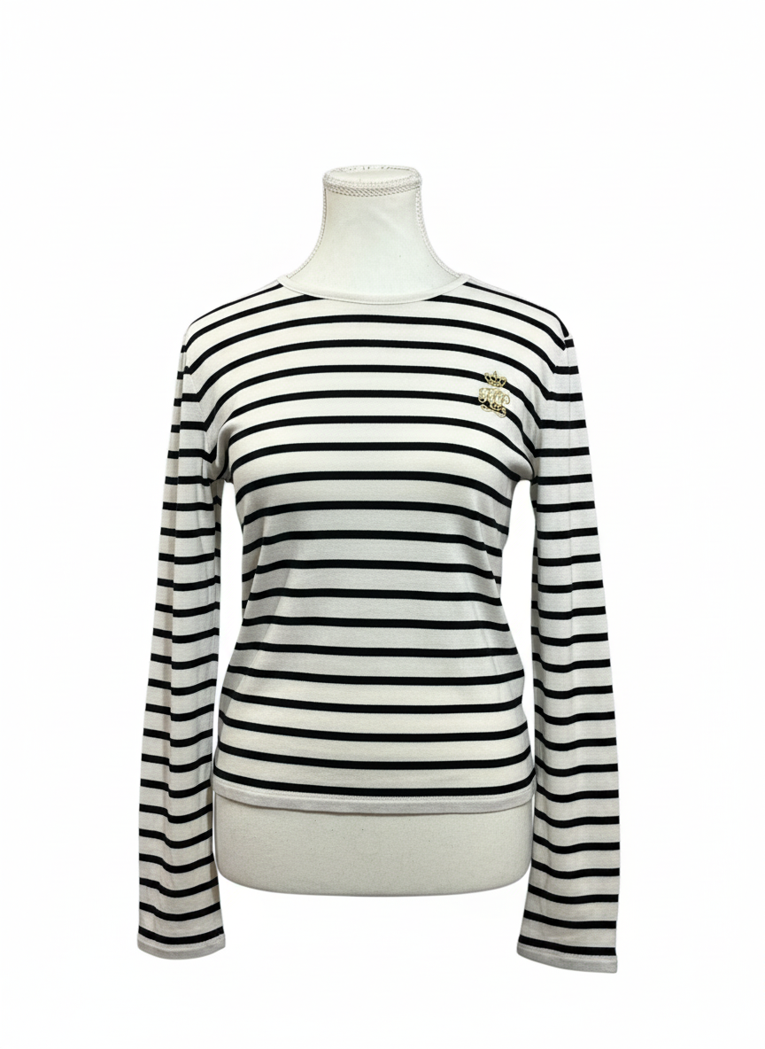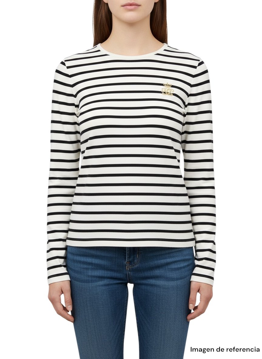 Presenta un diseño clásico de rayas negras sobre fondo blanco que nunca pasa de moda. Su estilo minimalista se complementa con un delicado detalle bordado en el pecho que aporta un toque sofisticado y distintivo. Confeccionada en tela suave y cómoda, es una prenda versátil que puede combinarse fácilmente con jeans, pantalones de vestir o faldas. Perfecta para un look casual elegante, para oficina o salidas informales donde quieras lucir arreglada sin perder comodidad.