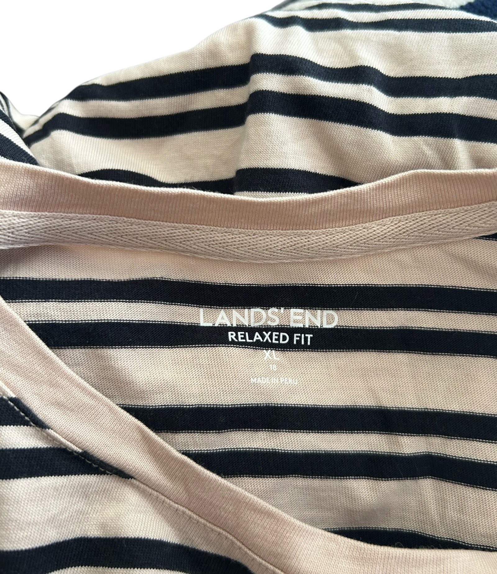 Esta camisa manga larga de Lands’ End, talla XL, es una pieza atemporal que combina estilo clásico y comodidad. Su diseño en tono beige con líneas negras crea un contraste sutil y sofisticado, perfecto para quienes buscan un look equilibrado entre casual y semiformal.