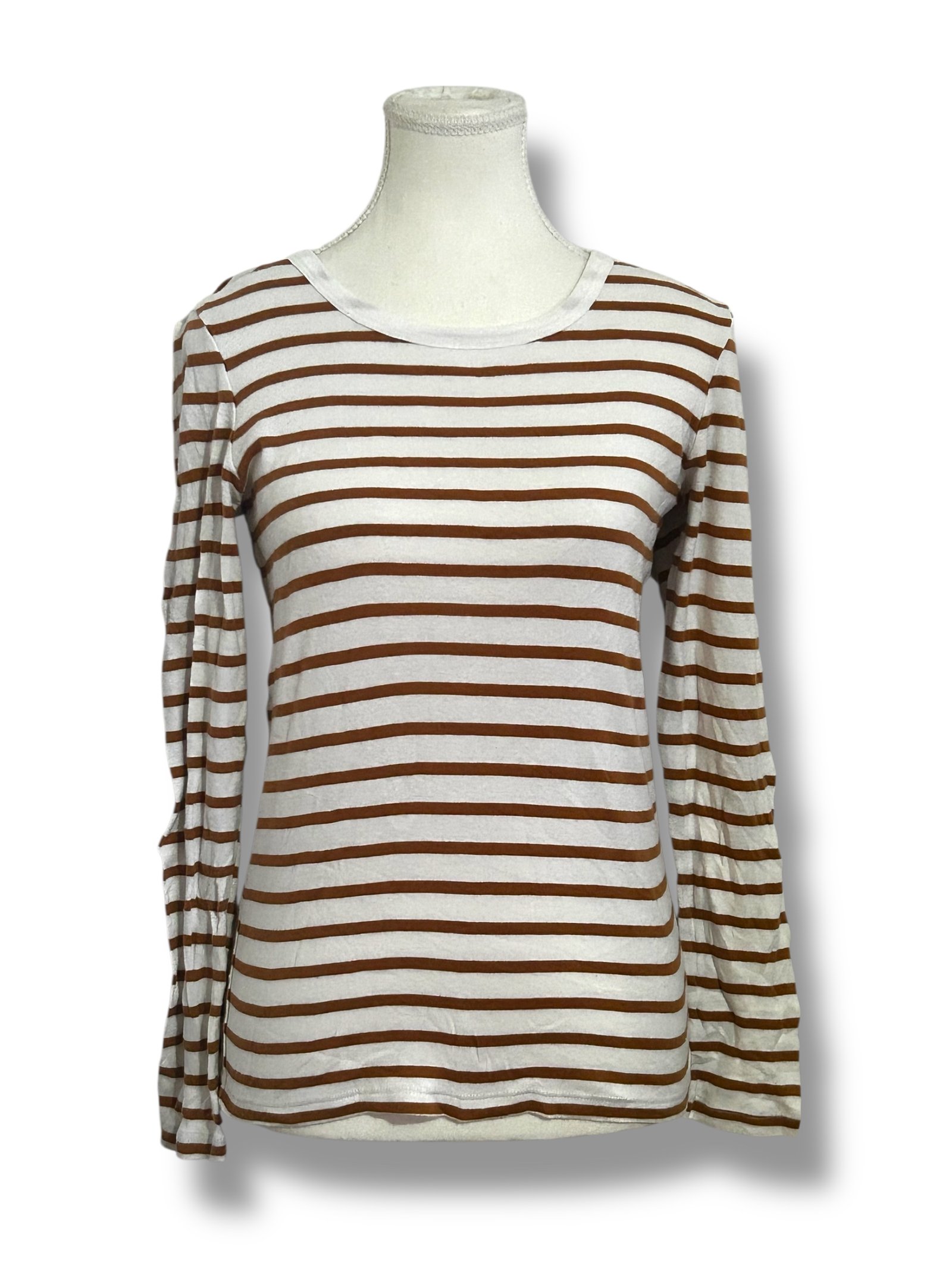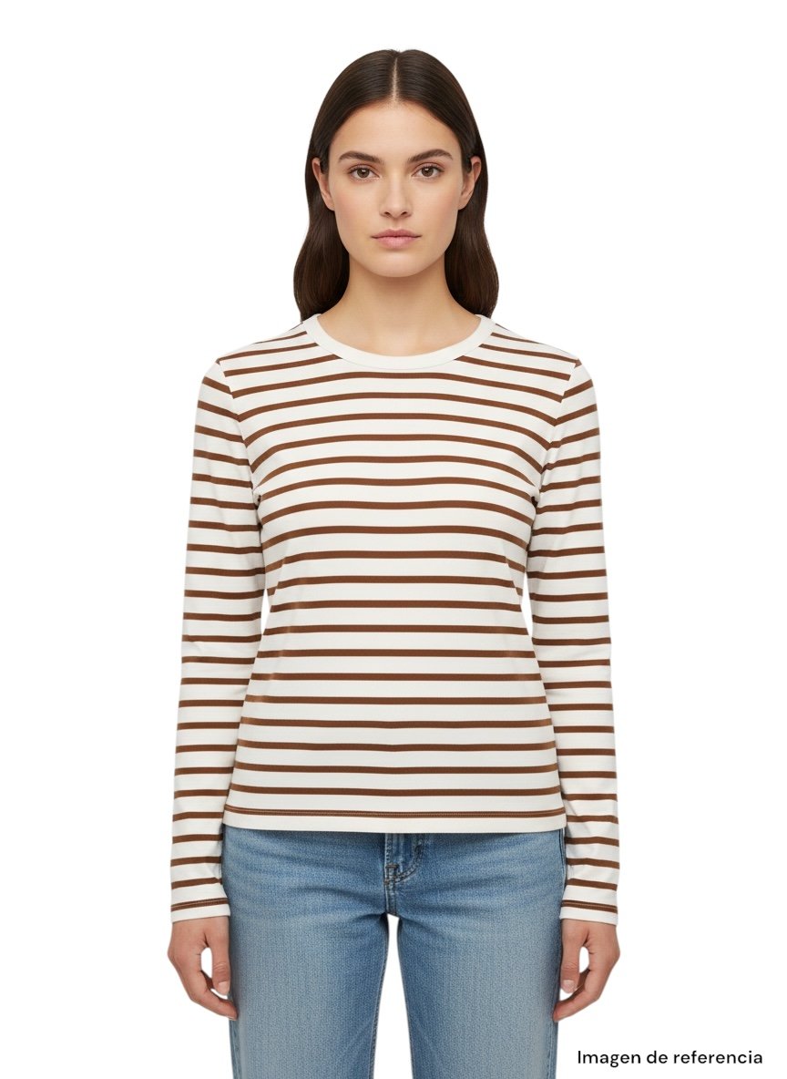 Tiene un diseño de rayas horizontales en tono café sobre fondo blanco, un estilo atemporal que nunca pasa de moda.
