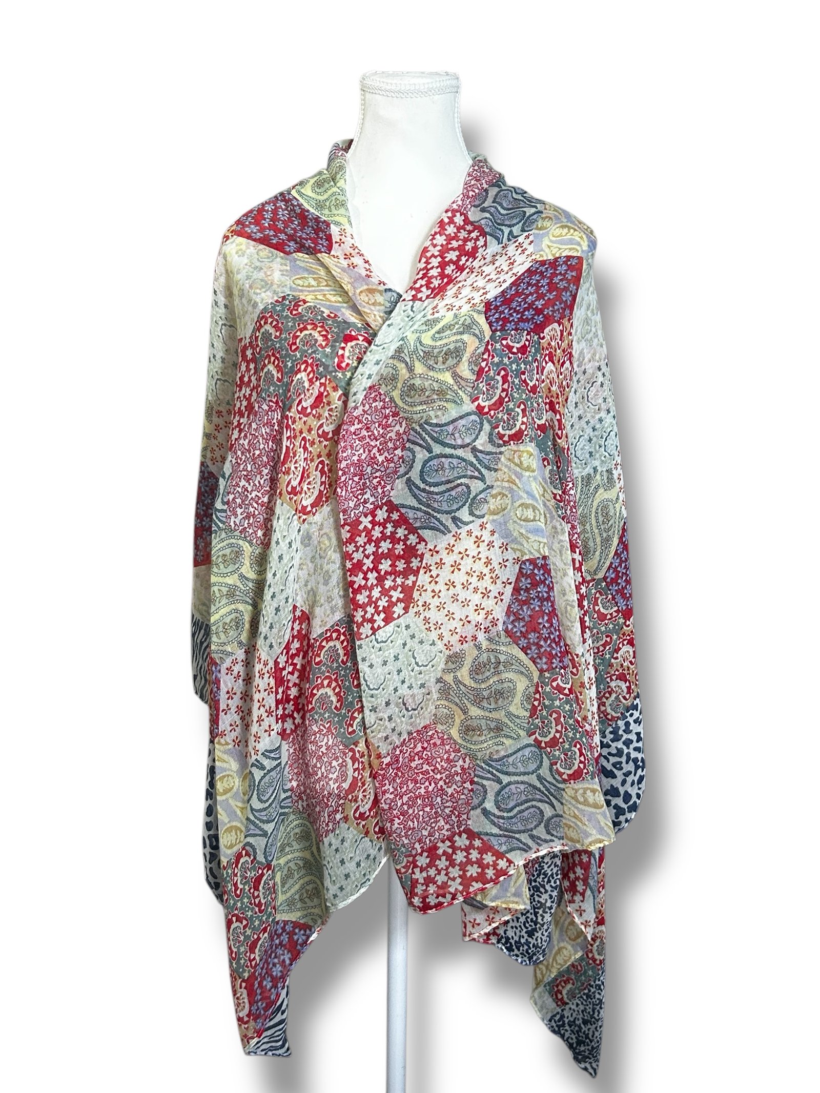 Hermoso chal ligero con un original diseño estilo patchwork que mezcla diferentes estampados paisley, florales y geométricos en una armoniosa combinación de colores como rojo, azul, beige, verde y detalles suaves en tonos neutros. Este diseño crea un efecto visual único y lleno de carácter.