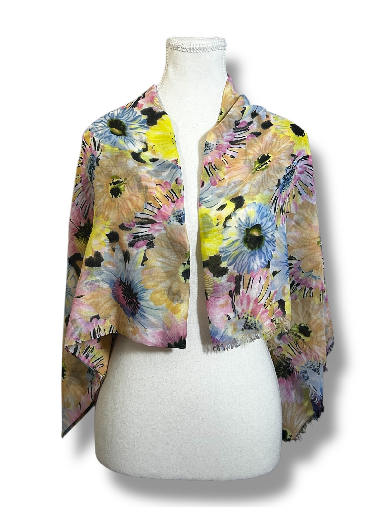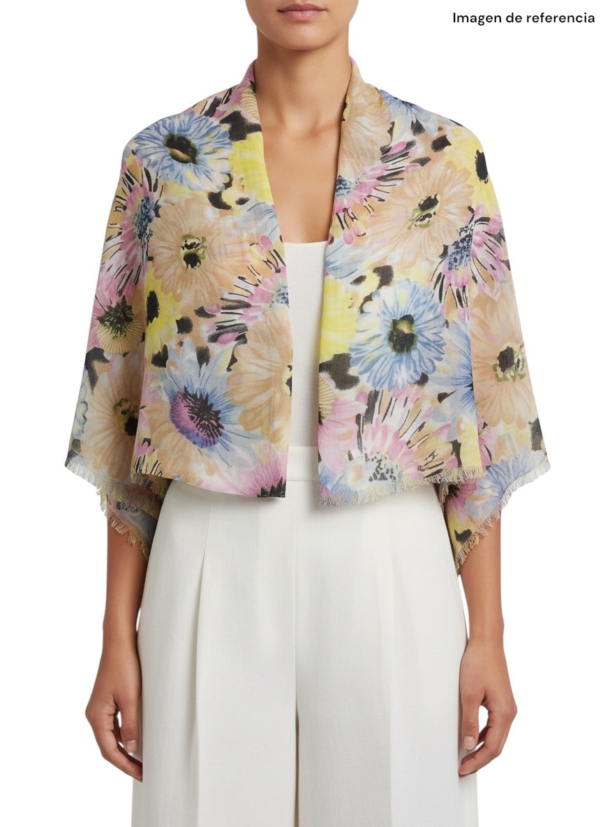 Encantador chal ligero con un llamativo estampado floral multicolor que combina tonos amarillos, rosados, azules, beige y toques oscuros que resaltan el diseño. Las flores grandes de estilo artístico crean un efecto vibrante y elegante, perfecto para añadir color y personalidad a cualquier conjunto.