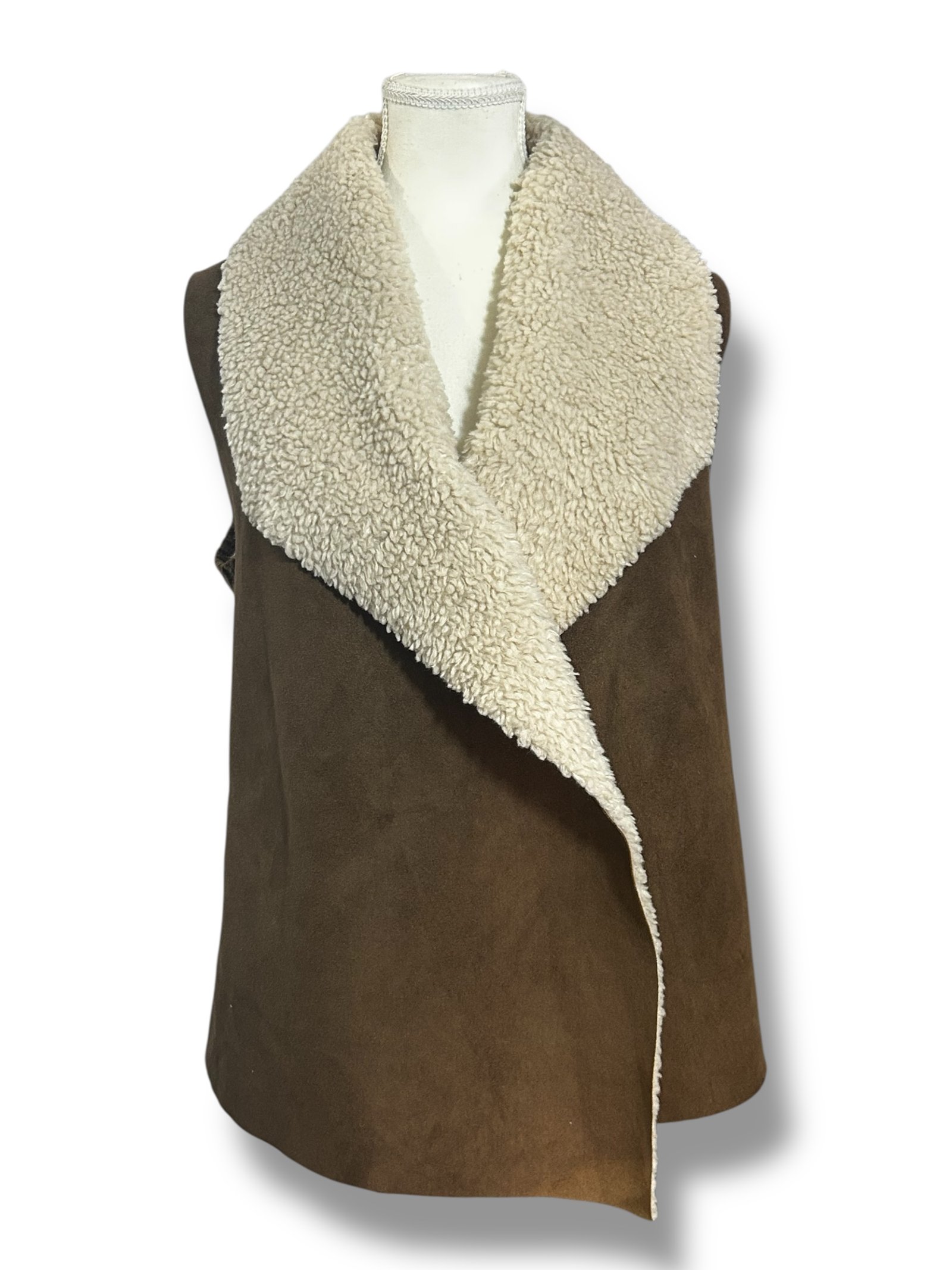 Hermoso chaleco para mujer en talla S con un elegante diseño en color café tipo gamuza que aporta un estilo moderno, casual y muy versátil. Su interior cuenta con un suave forro tipo sherpa en tono crema que brinda calidez, comodidad y un toque acogedor ideal para climas frescos.