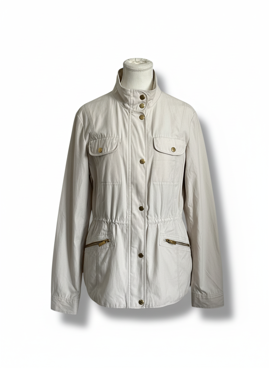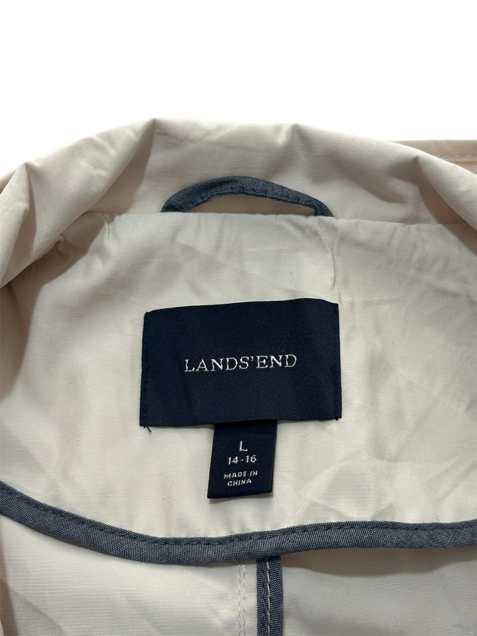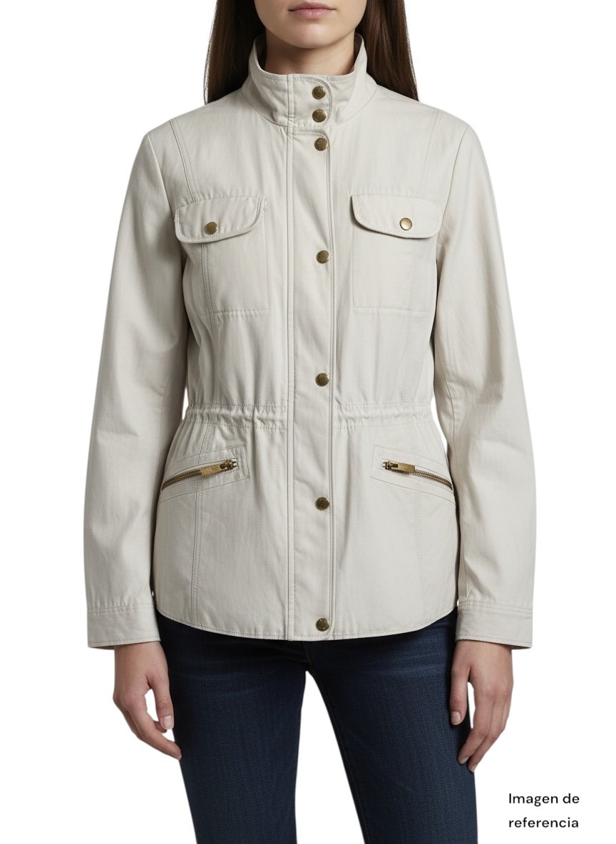 Chaqueta ligera de la marca Lands’ End en tono beige claro, talla L (14-16), perfecta para un estilo casual y versátil. Diseñada con cuello alto tipo militar y cierre frontal de botones metálicos dorados que aportan un toque elegante. Incluye dos bolsillos superiores con solapa y botón, además de dos bolsillos inferiores con cierre de cremallera, brindando practicidad y estilo.