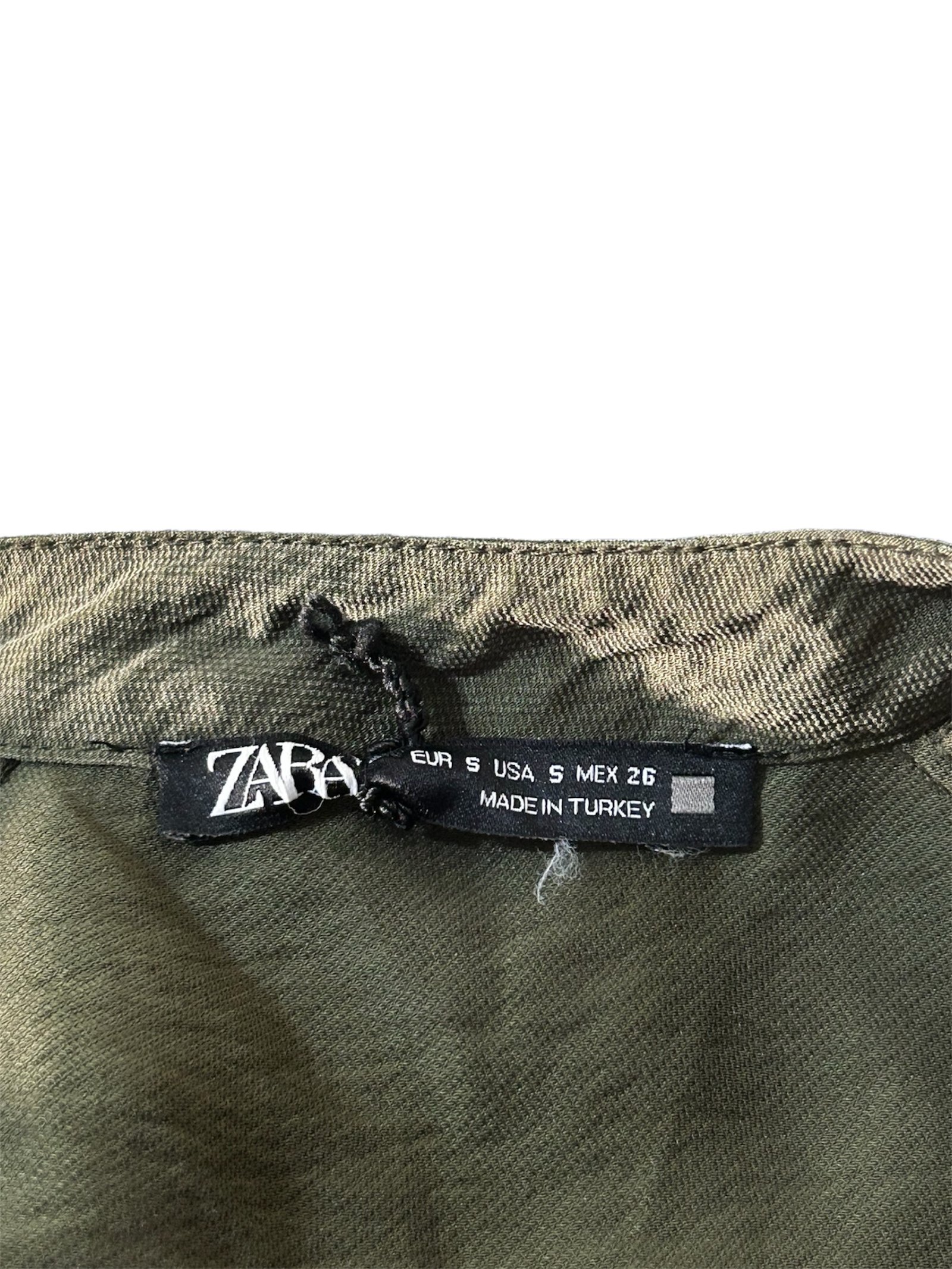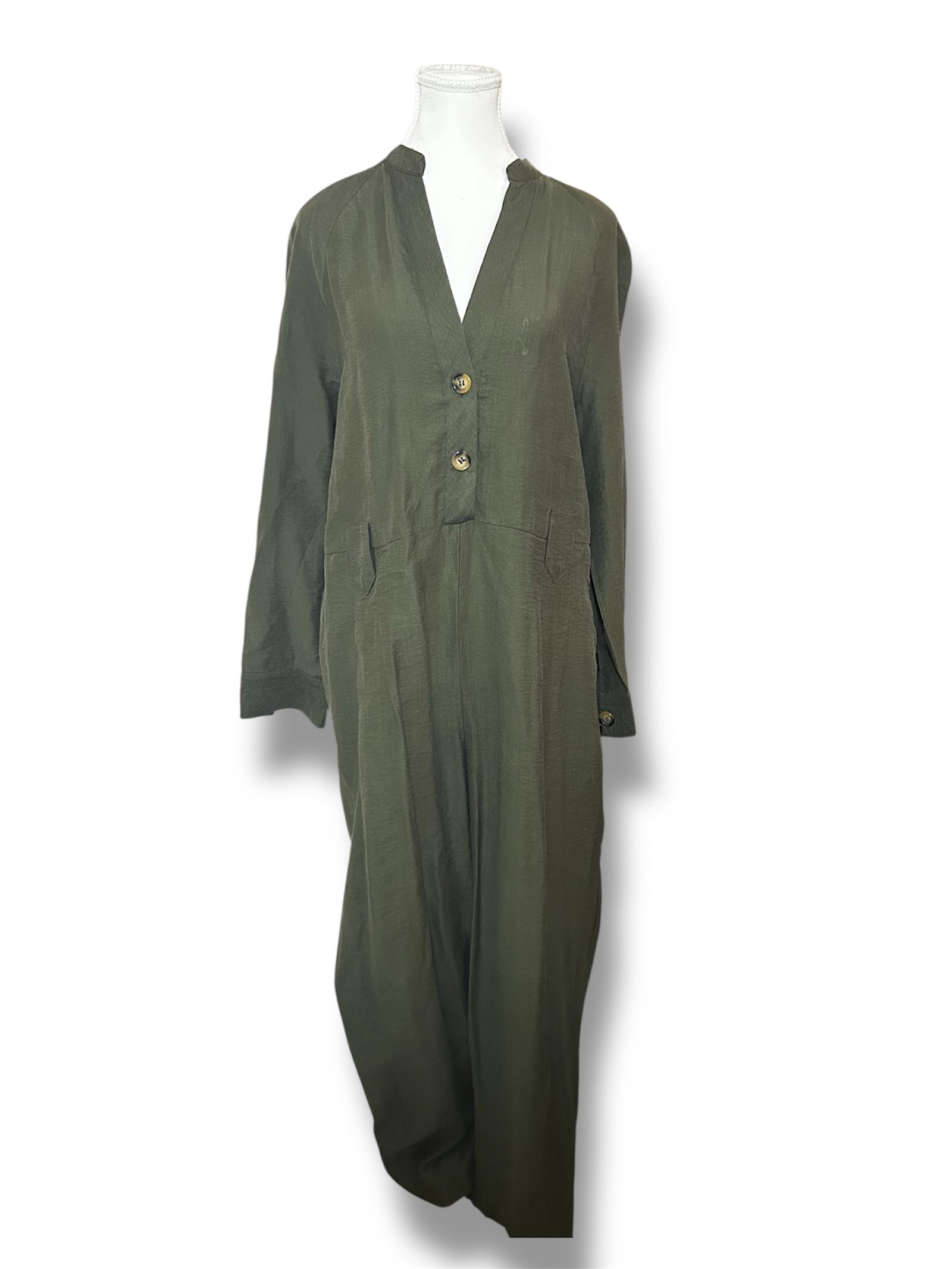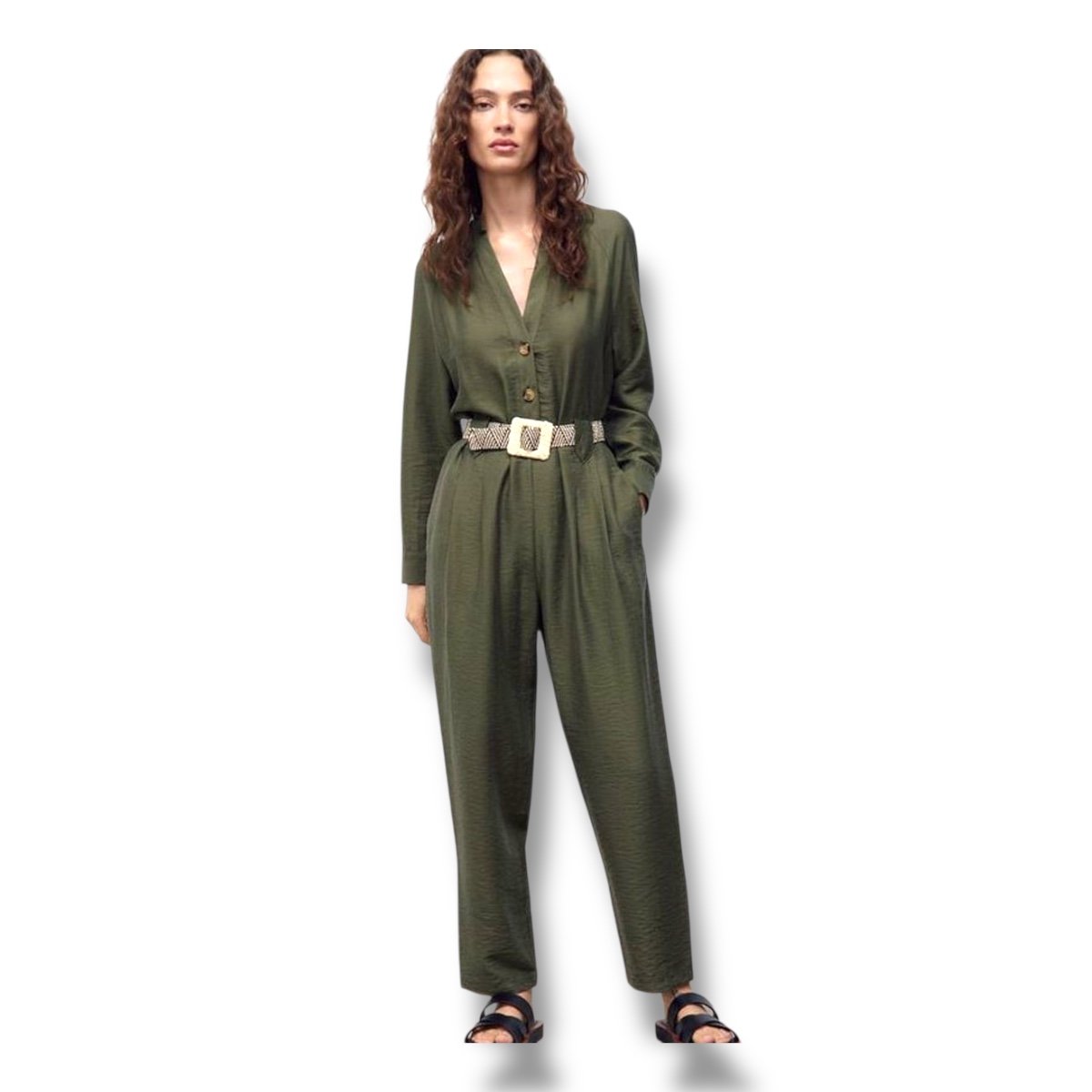 Enterizo ZARA talla S en color verde olivo, con diseño elegante y relajado. Manga larga, escote en V con botones y bolsillos funcionales. Súper cómodo, versátil y perfecto para uso diario o looks más arreglados.