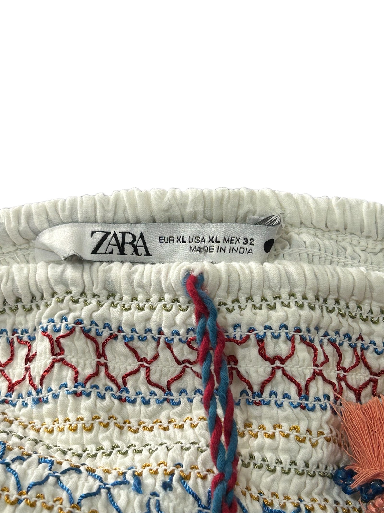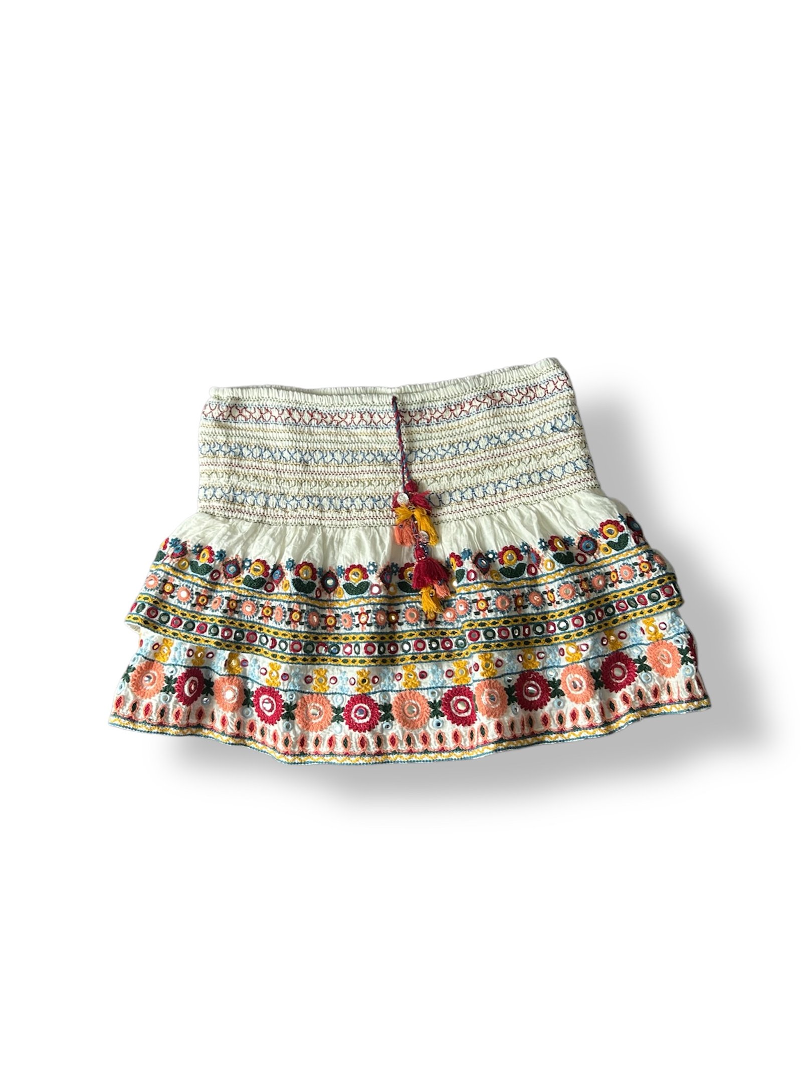 Falda Zara talla XL con diseño boho bordado multicolor, cintura elástica tipo smock y detalles de borlas. Ligera, fresca y perfecta para verano.