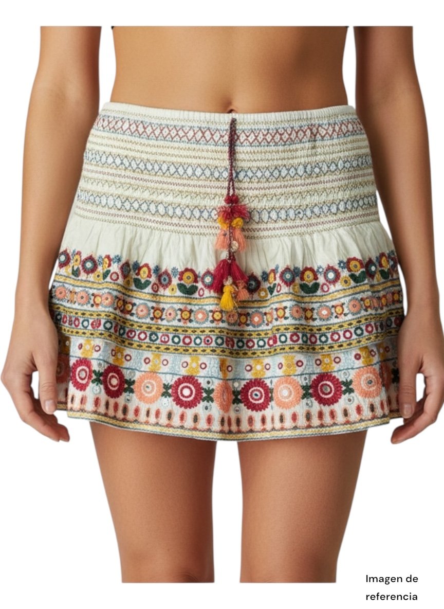 Hermosa falda de la marca Zara en talla XL, confeccionada en tela ligera y fresca, ideal para climas cálidos. Destaca por su estilo bohemio con elaborados bordados multicolor en patrones florales y geométricos que le dan un toque artesanal y único.