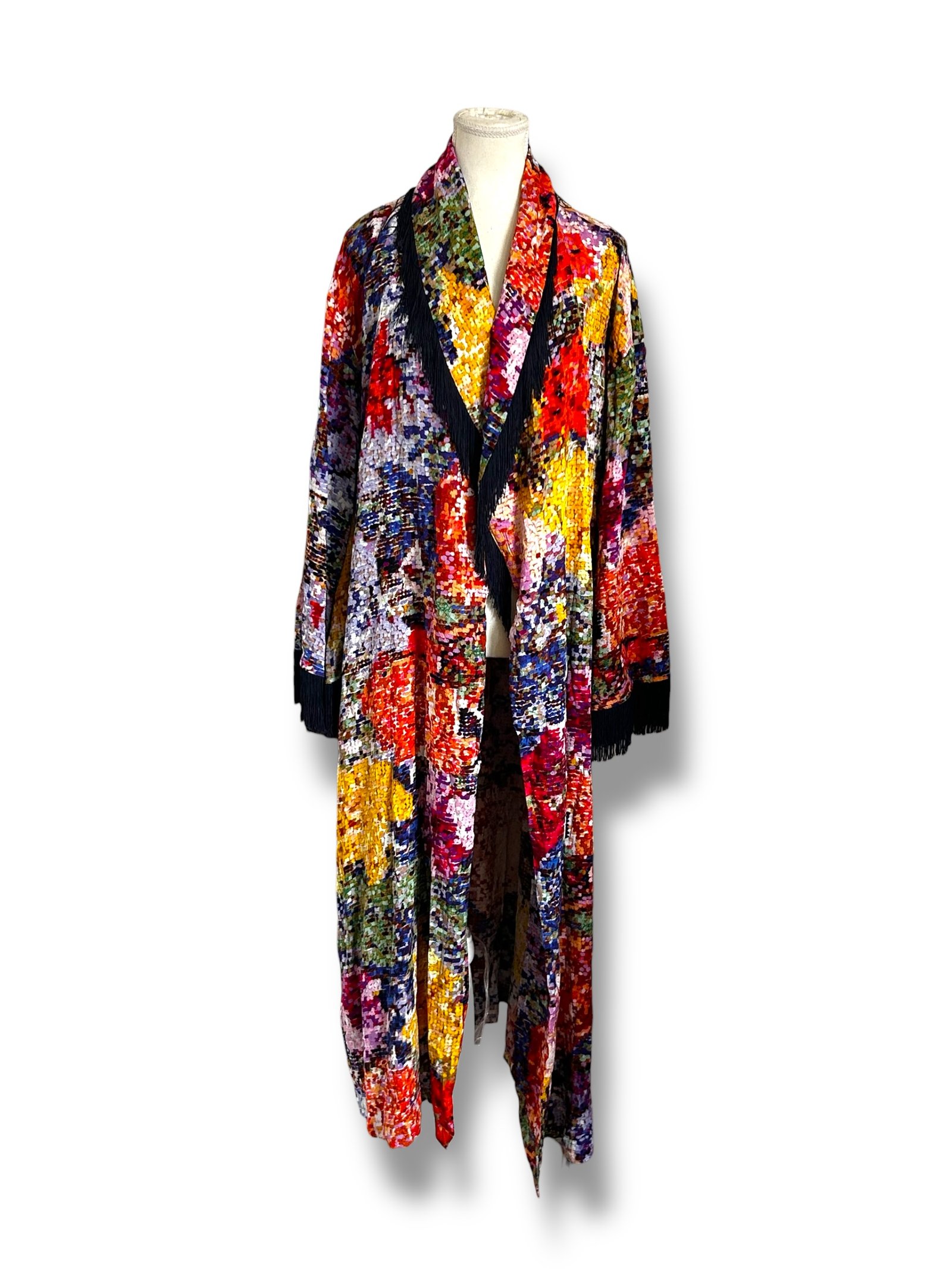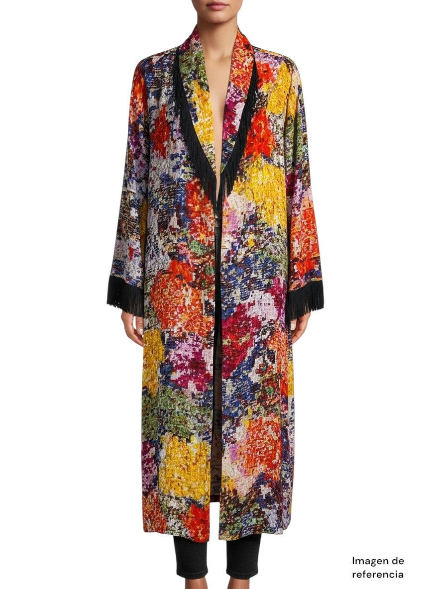 Fringe Poncho de la marca KIRSTIN LAMB exclusively for Anthropologie, en talla S, confeccionado en un tejido ligero y fluido que brinda movimiento y comodidad. Destaca por su llamativo estampado multicolor con efecto artístico tipo mosaico, que combina tonos rojos, naranjas, amarillos, azules y verdes. Su diseño abierto al frente incorpora detalles de flecos negros en el borde, aportando un estilo bohemio y sofisticado. Las mangas amplias y su caída larga lo convierten en una prenda versátil, perfecta para usar sobre outfits básicos y darles un toque único. Ideal para ocasiones casuales, salidas o como pieza statement en tu guardarropa.