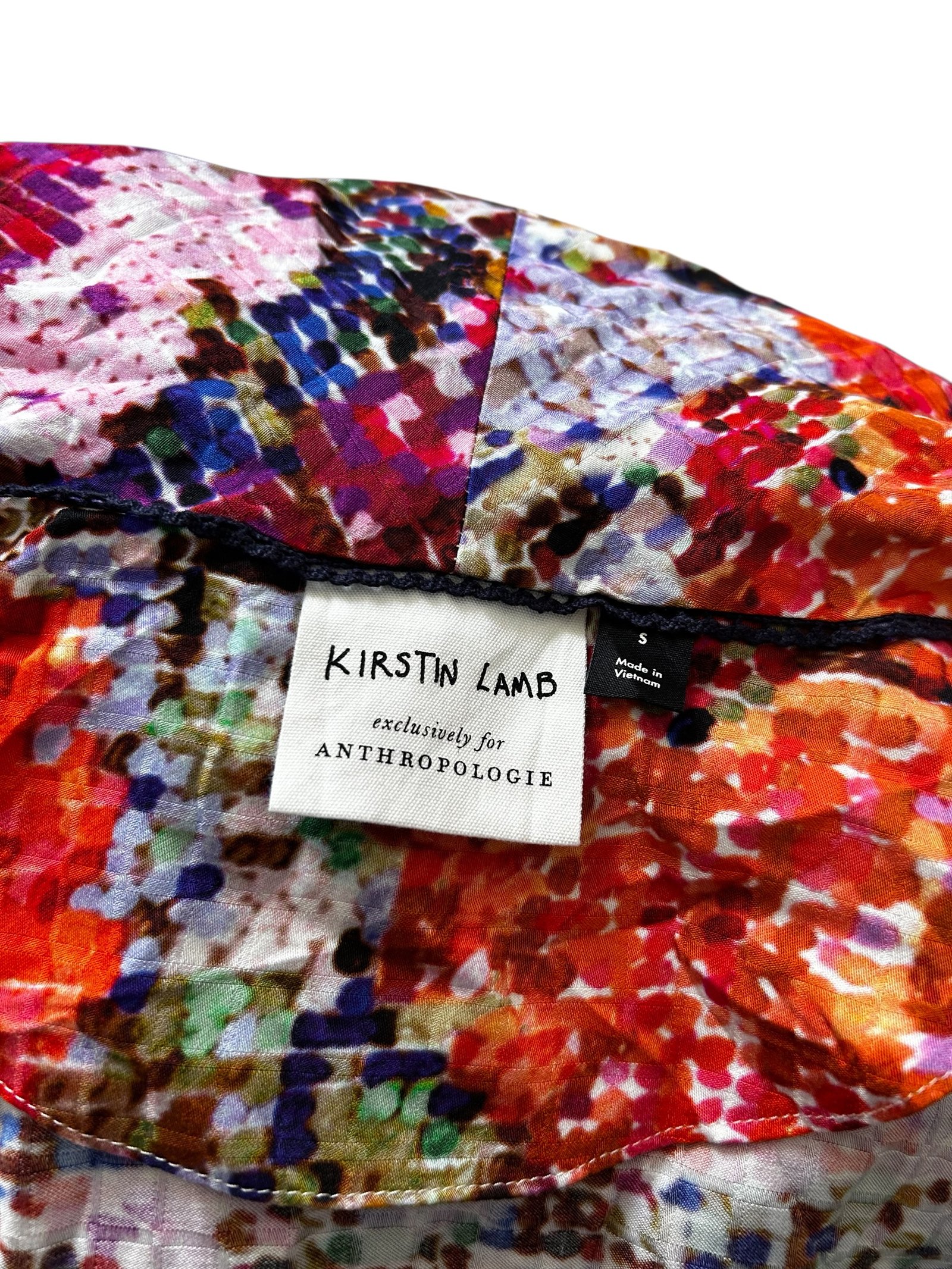Fringe Poncho de la marca KIRSTIN LAMB para Anthropologie en talla S, con vibrante estampado multicolor tipo artístico. Diseño abierto con detalles de flecos negros, ideal para elevar cualquier look.