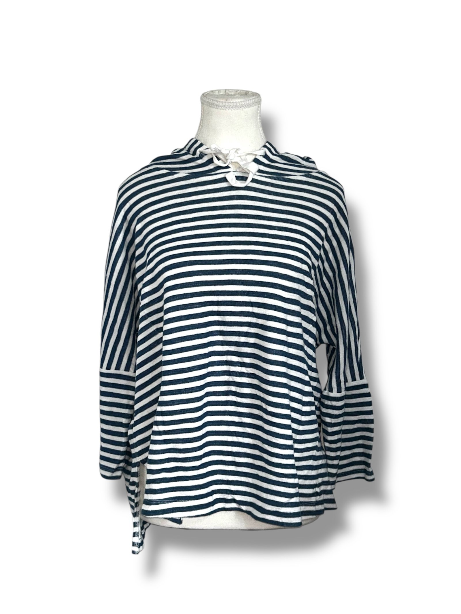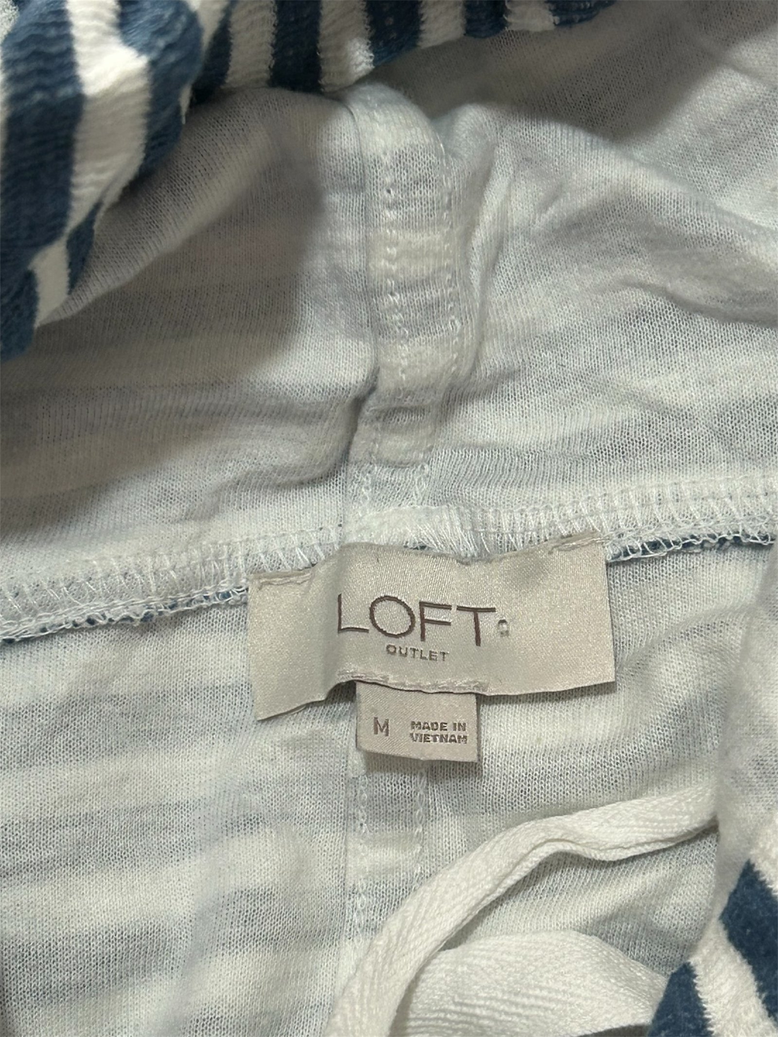 Hoodie ligero de la marca LOFT OUTLET en talla M, ideal para un look casual y cómodo. Presenta un diseño de rayas horizontales en tonos azul y blanco que aporta un estilo clásico y versátil.