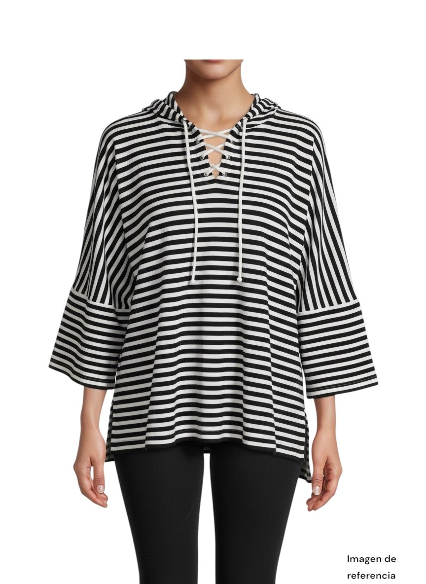 Cuenta con capucha y lazo ajustable en el cuello, lo que le da un toque relajado tipo sudadera pero en una versión más ligera. Sus mangas largas con aberturas añaden un detalle moderno y mayor libertad de movimiento.