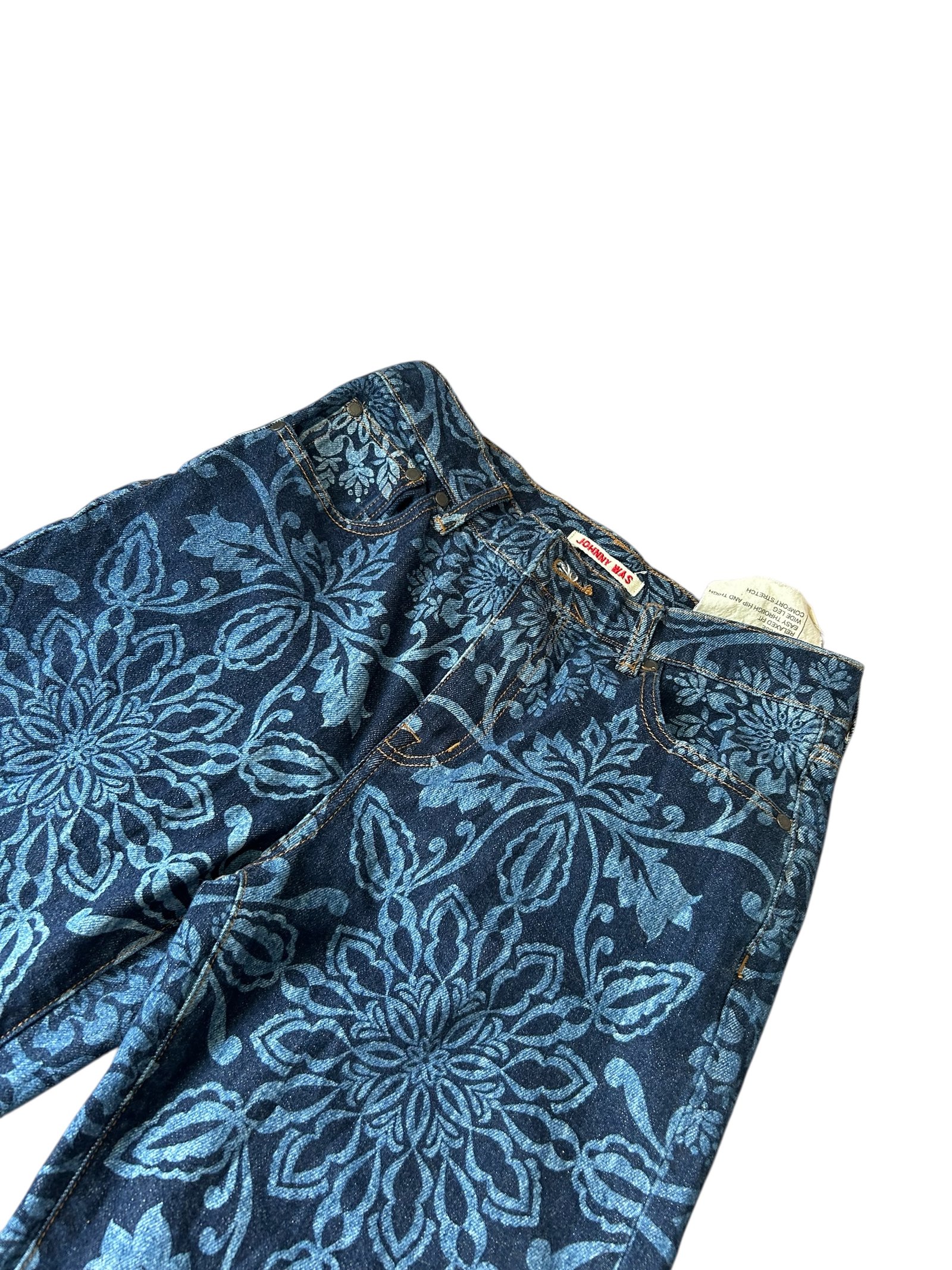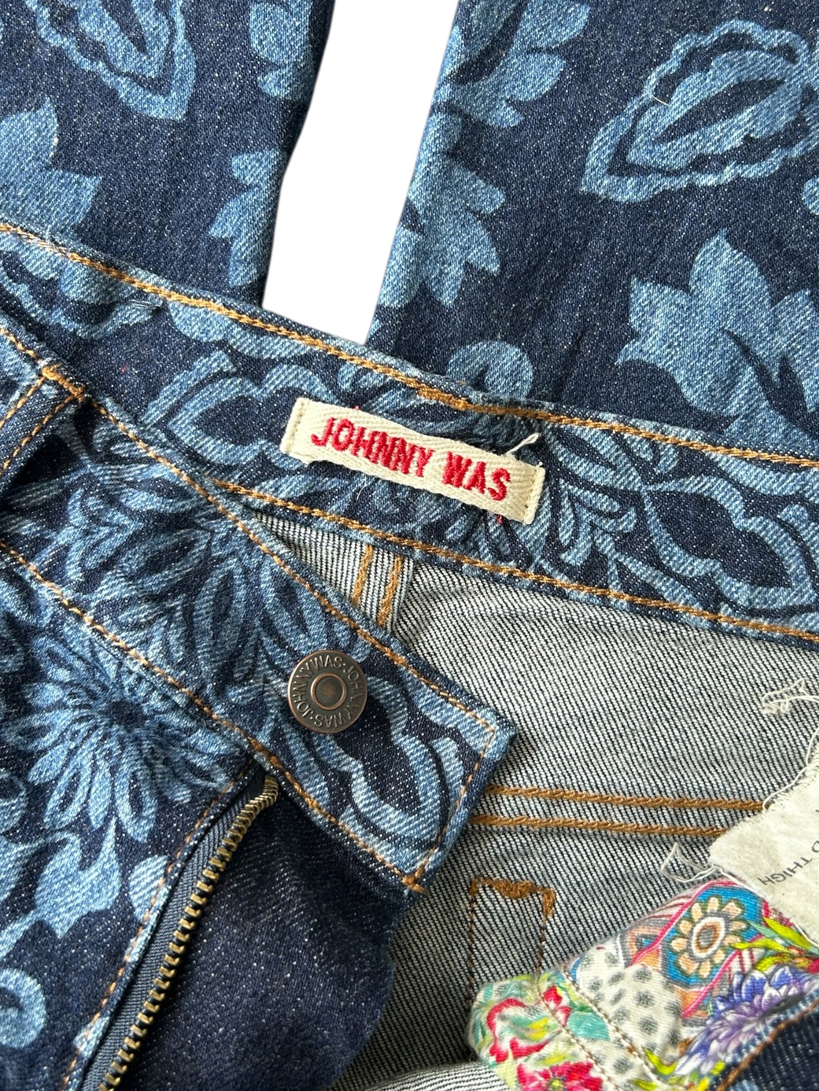 Jean acampanado JOHNNY WAS con estampado floral en tonos azules, ideal para looks casuales con estilo boho.