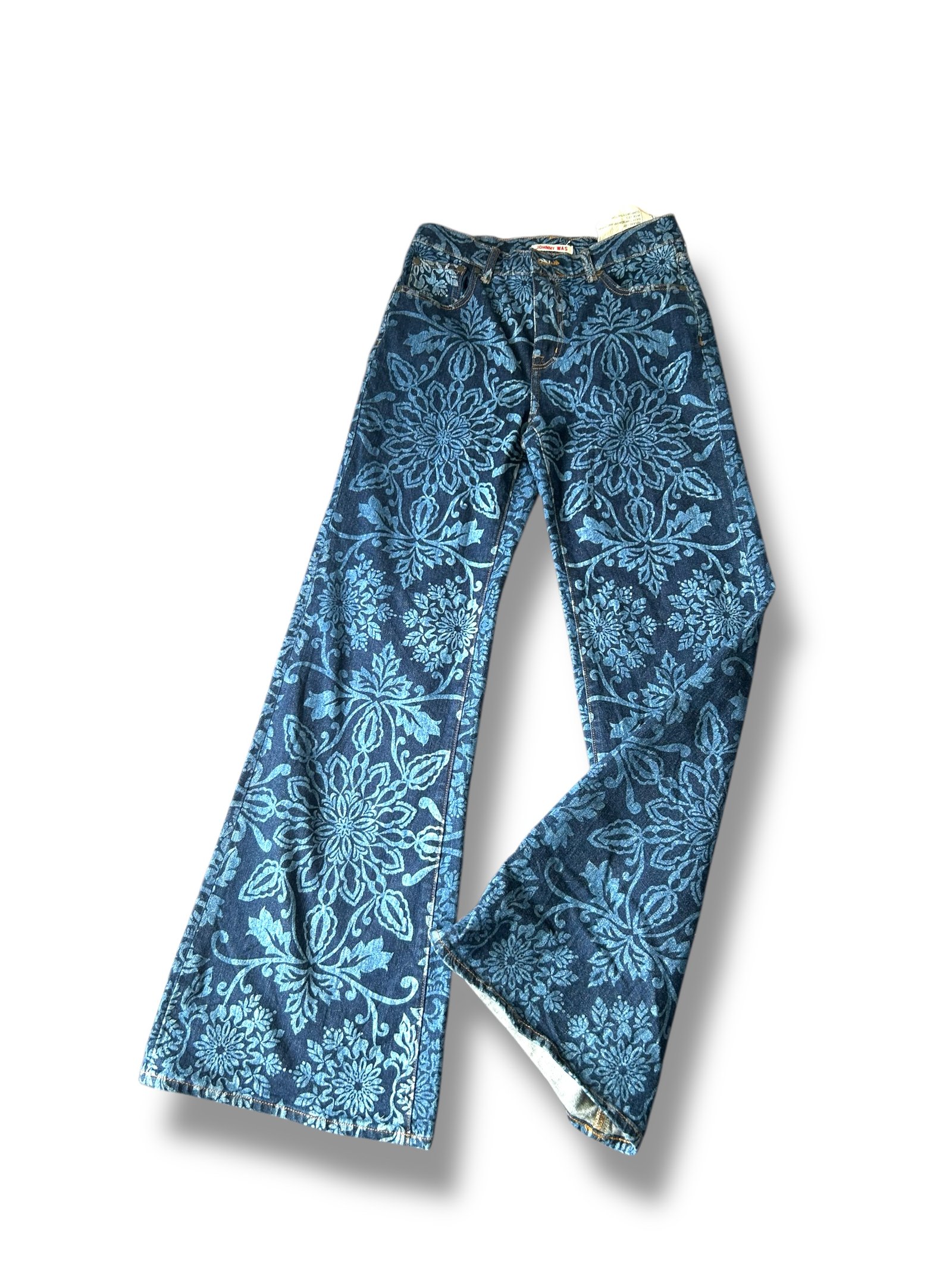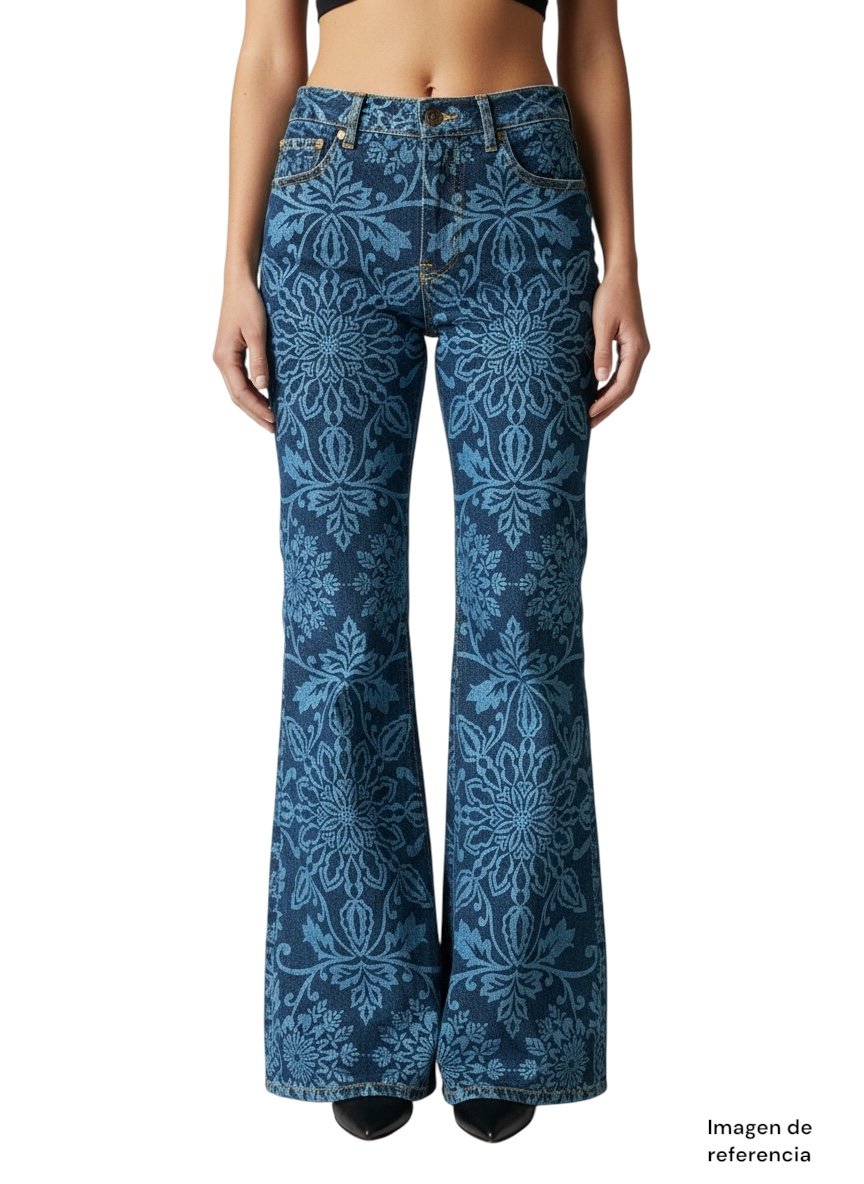 Pantalón de mezclilla de la marca Johnny Was con un hermoso estampado floral en tonos azules que le da un toque único y llamativo. Su corte flare (acampanado) estiliza la silueta y aporta un aire retro muy en tendencia. Cuenta con cierre de botón y zipper, tiro medio y bolsillos funcionales. Perfecto para combinar con blusas básicas o prendas más elevadas y crear outfits casuales con personalidad.