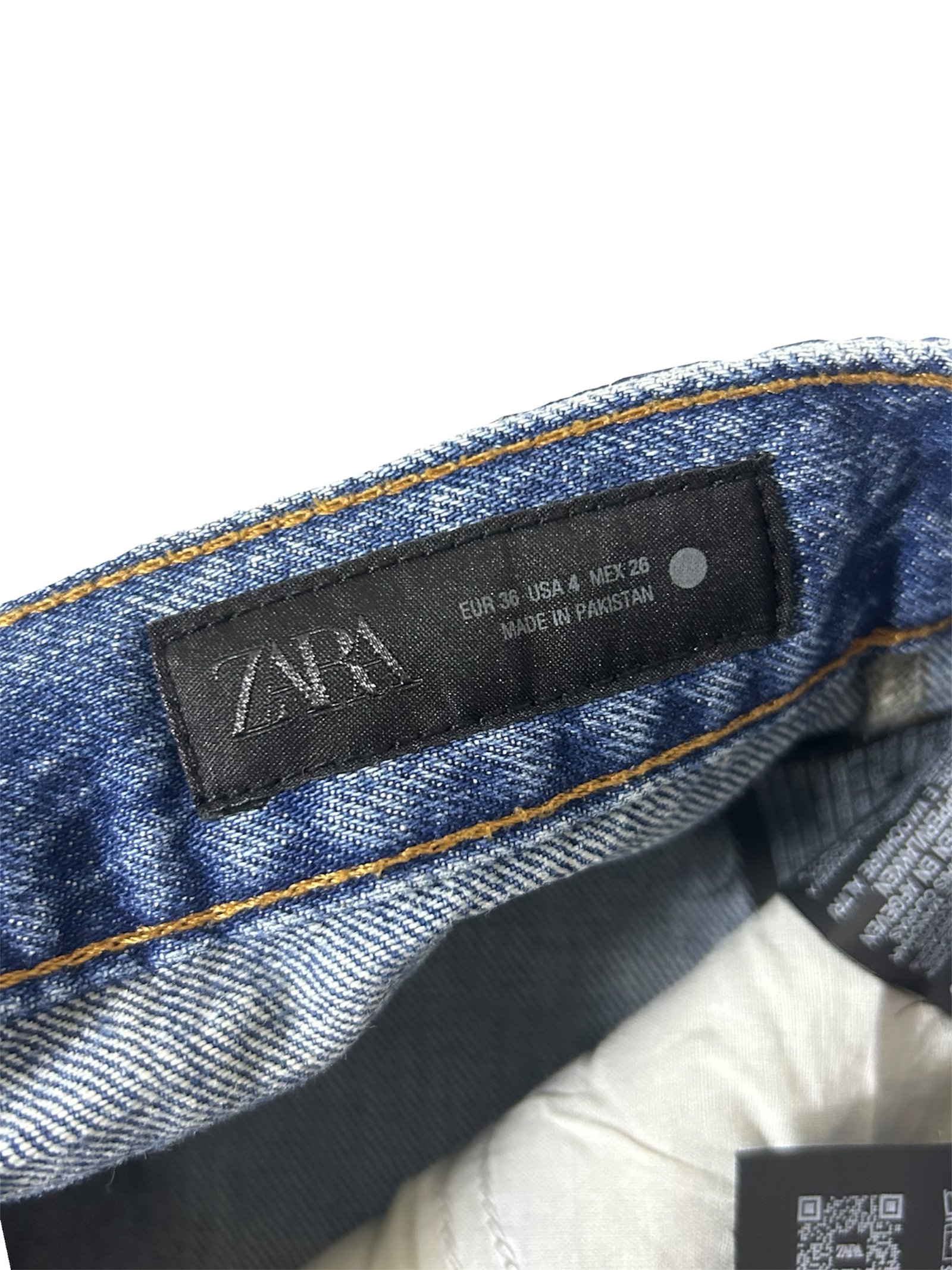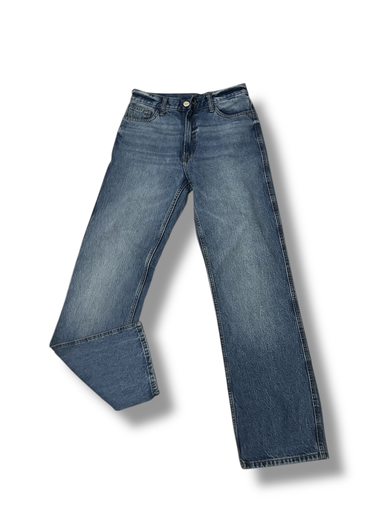 Jeans azul añejo de Zara, talla 4, con corte recto y tiro alto que estiliza la figura. Clásico, cómodo y fácil de combinar para looks casuales o urbanos.