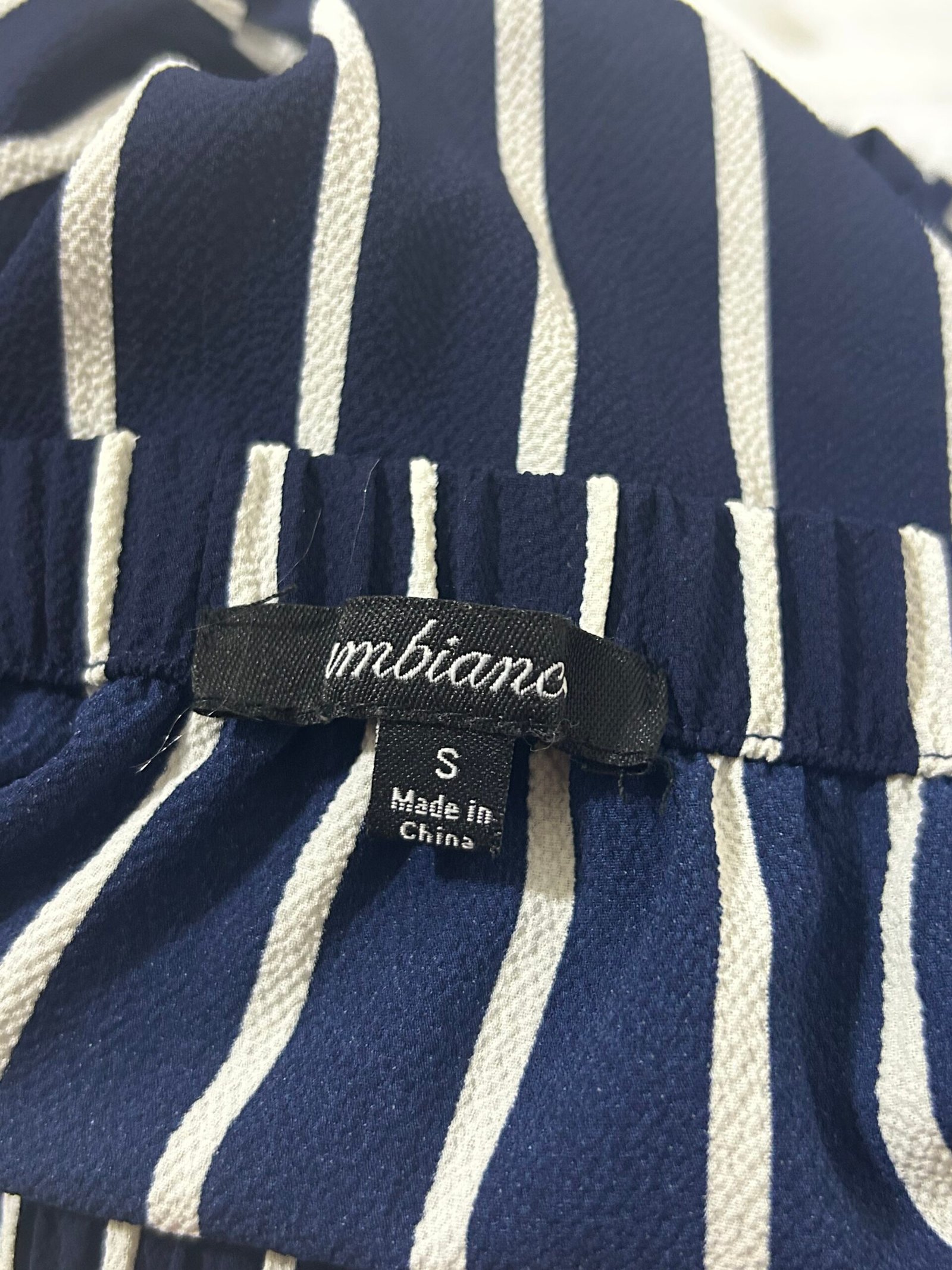 Elegante jumpsuit strapless de Mbians con diseño de rayas verticales en azul marino y blanco que estilizan la figura. Su corte cómodo y moderno lo convierte en una prenda ideal para looks casuales o salidas con estilo. Talla S.