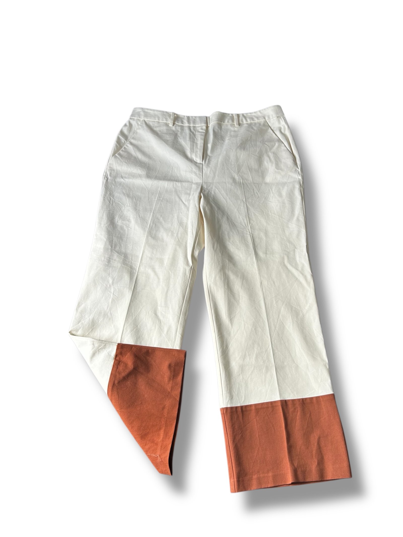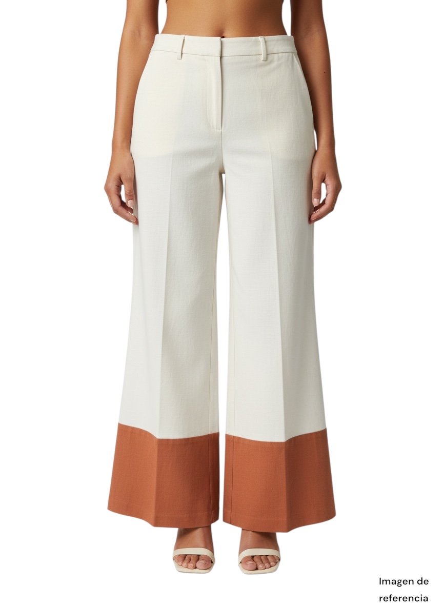 Este pantalón de Alfani combina elegancia clásica con un toque moderno gracias a su diseño de bloques de color. Confeccionado en un tono crema sofisticado, destaca por su detalle en contraste en la parte inferior de las piernas en color terracota, lo que lo convierte en una pieza única y llamativa sin perder versatilidad.
