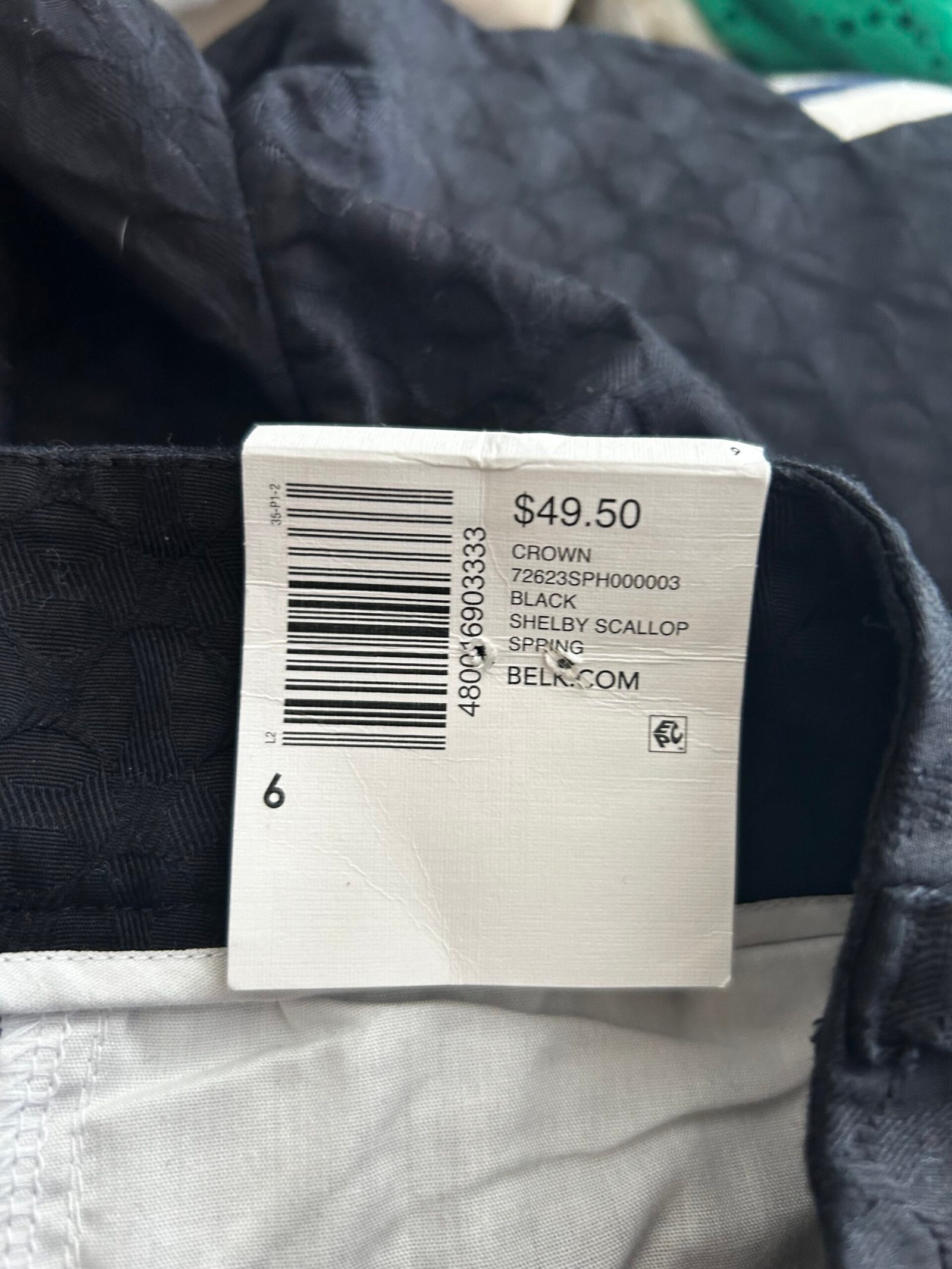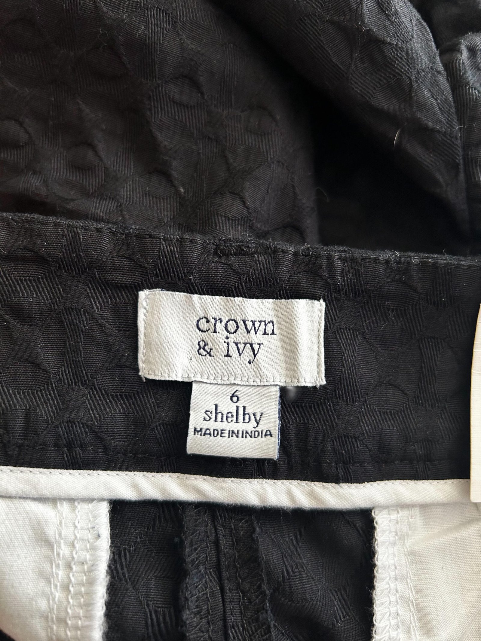 Elegante short de la marca Crown & Ivy en talla 6, confeccionado en un clásico color negro que lo convierte en una prenda versátil y fácil de combinar. Su diseño destaca por el detalle de borde ondulado (scalloped hem) que le aporta un toque femenino y delicado.