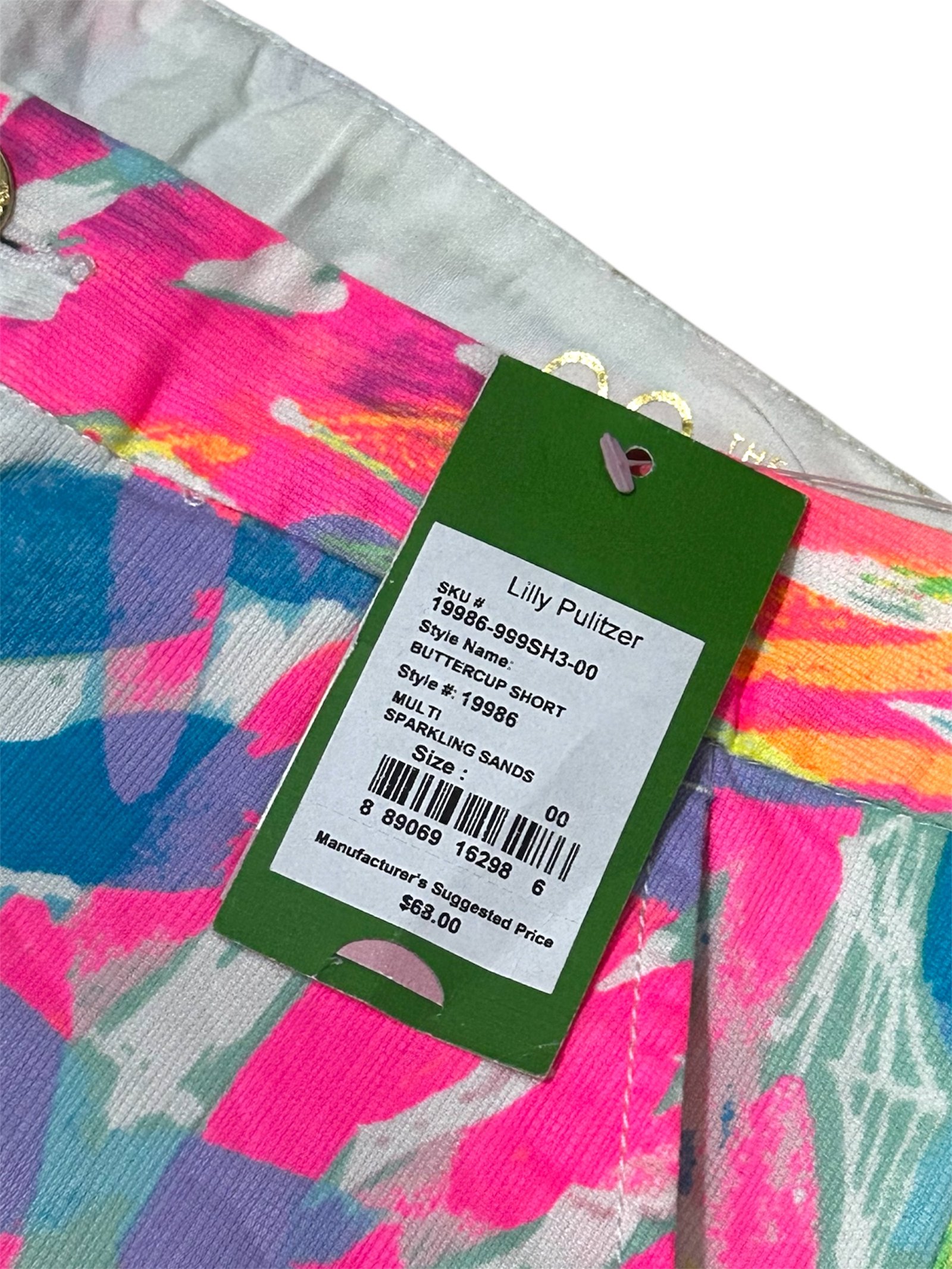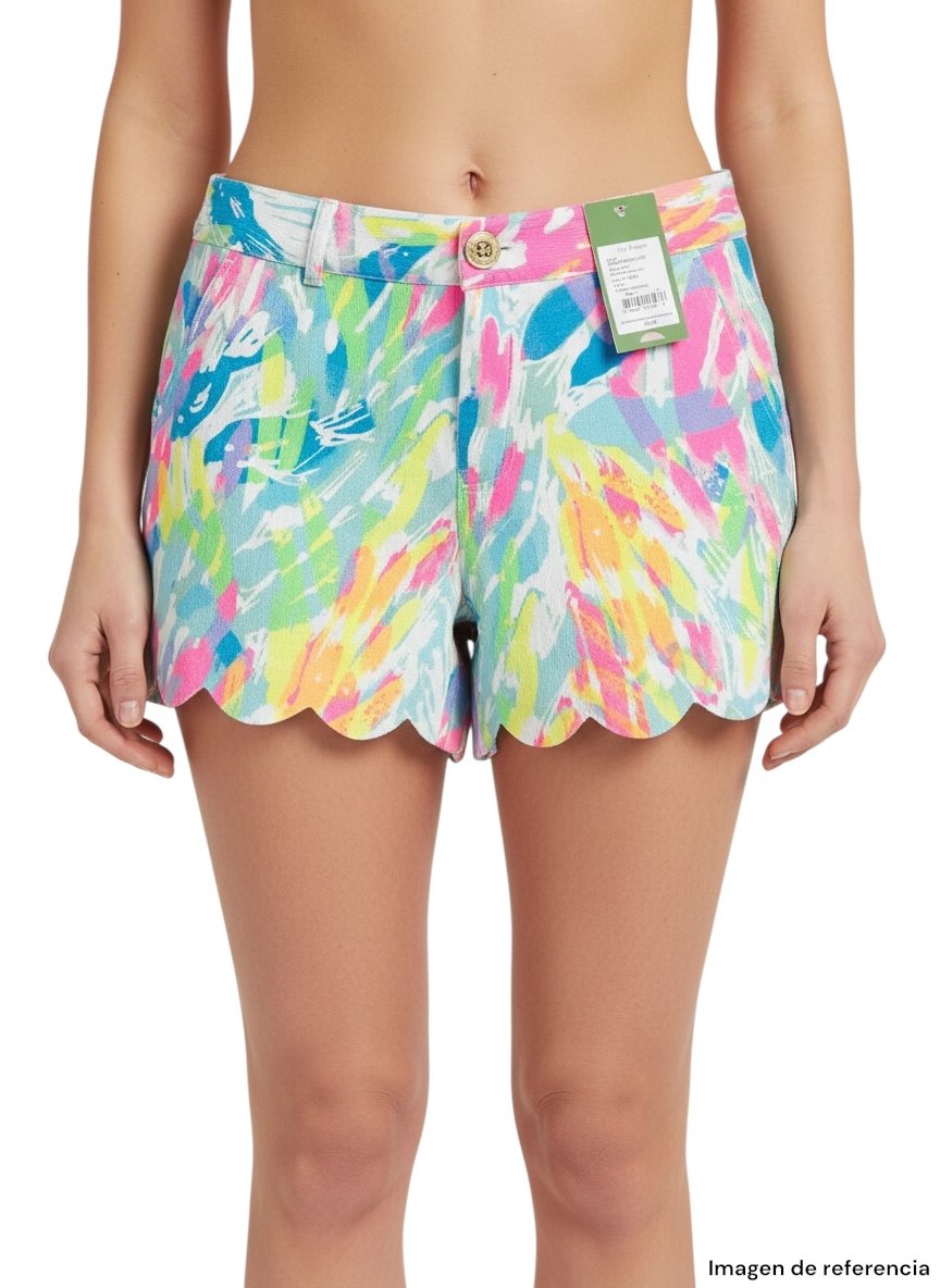 Short estampado multicolor de Lilly Pulitzer, talla 00, con diseño vibrante y borde ondulado. Ideal para looks frescos y llamativos.