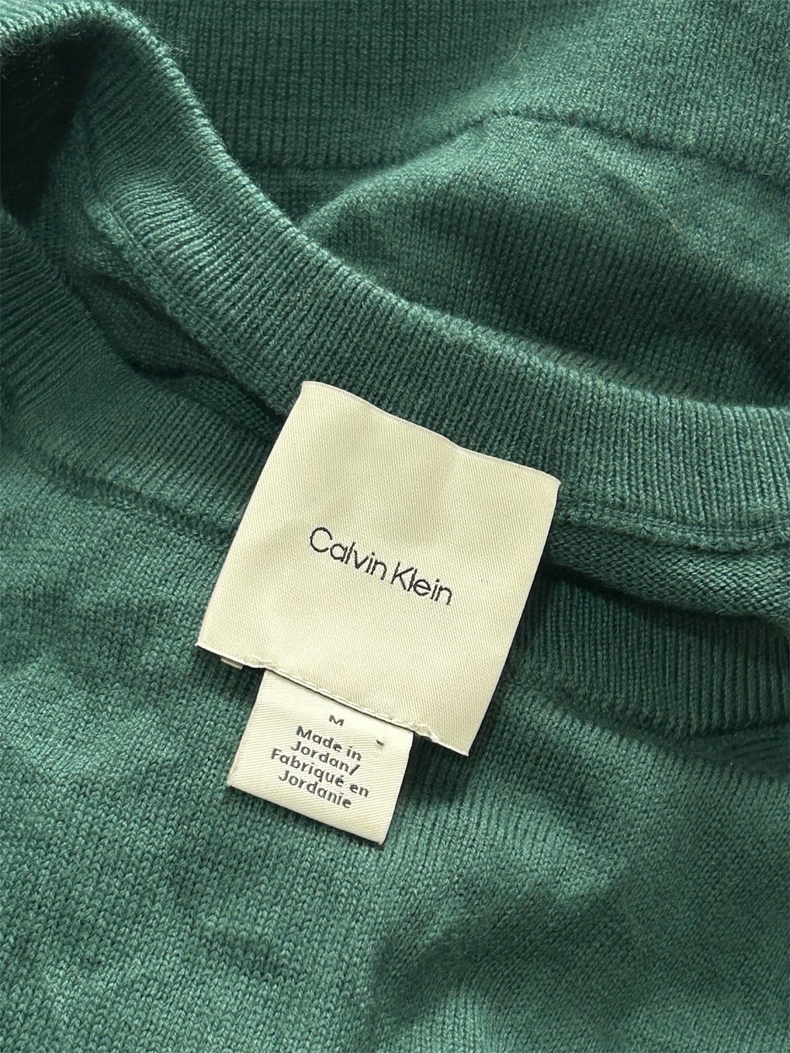 Suéter Calvin Klein de punto fino en color verde, manga larga, cuello redondo y ajuste cómodo. Talla M.