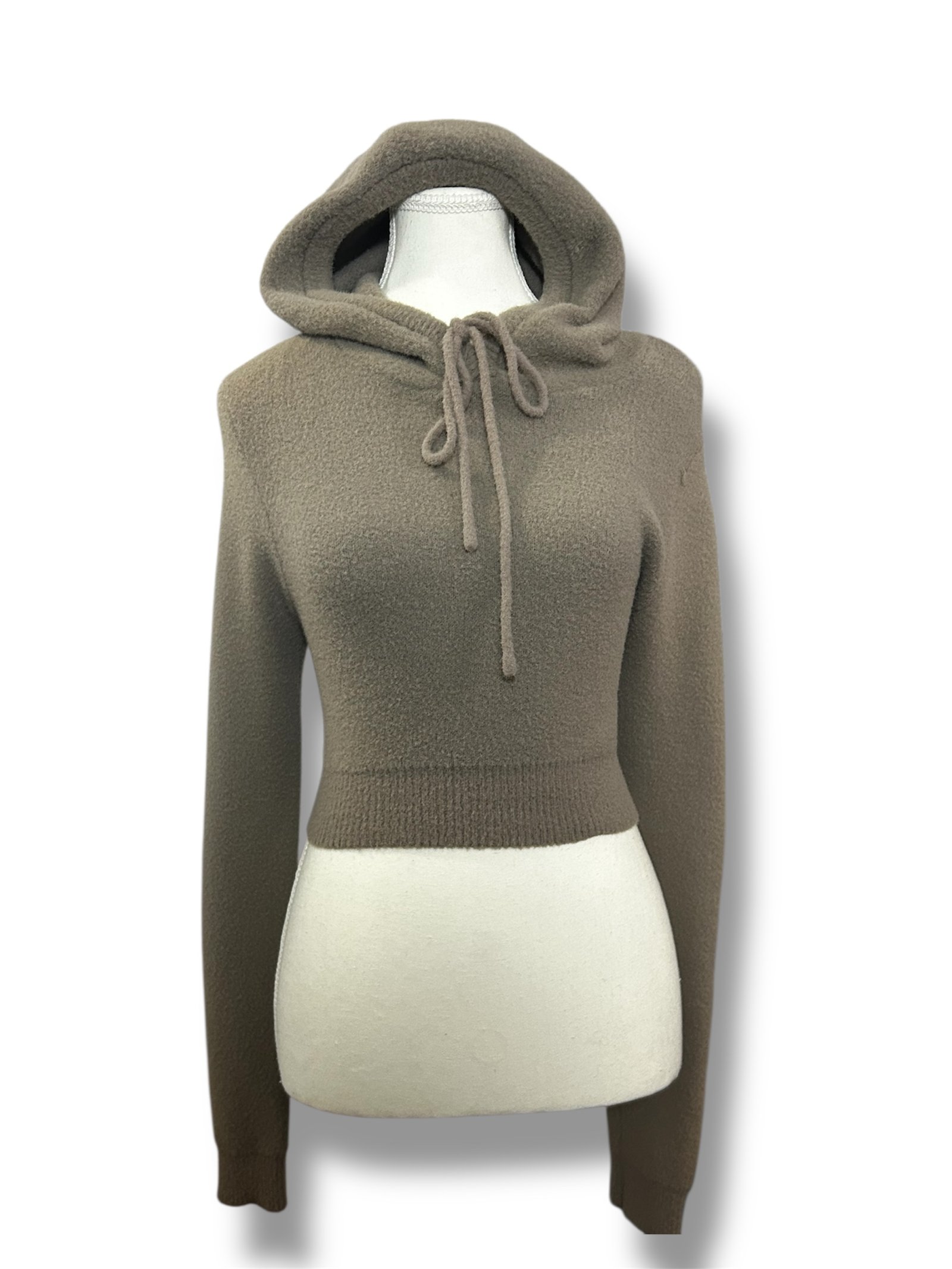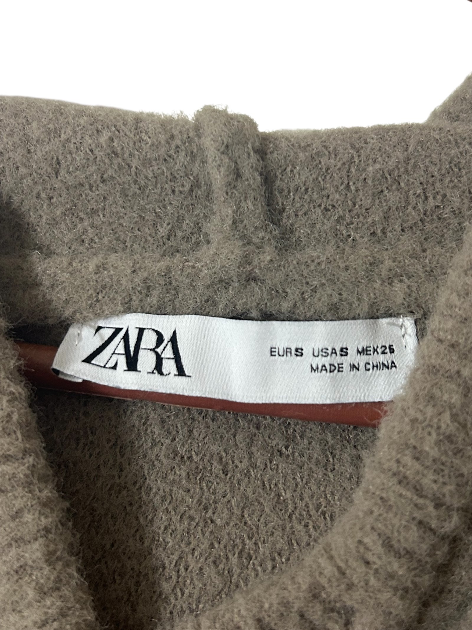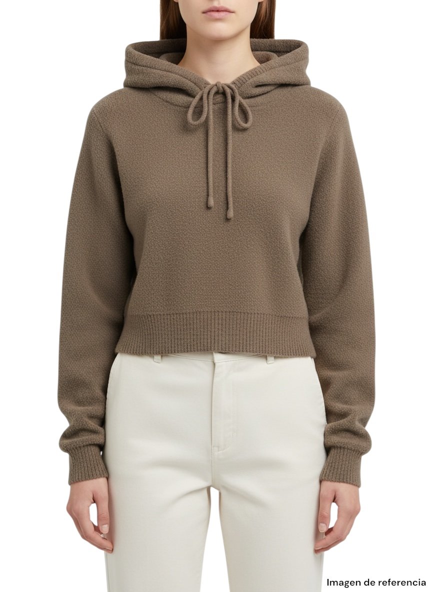 Suéter Zara en talla S con diseño cropped y capucha ajustable con cordones. Su textura suave y su color beige neutro lo convierten en una prenda versátil y fácil de combinar.