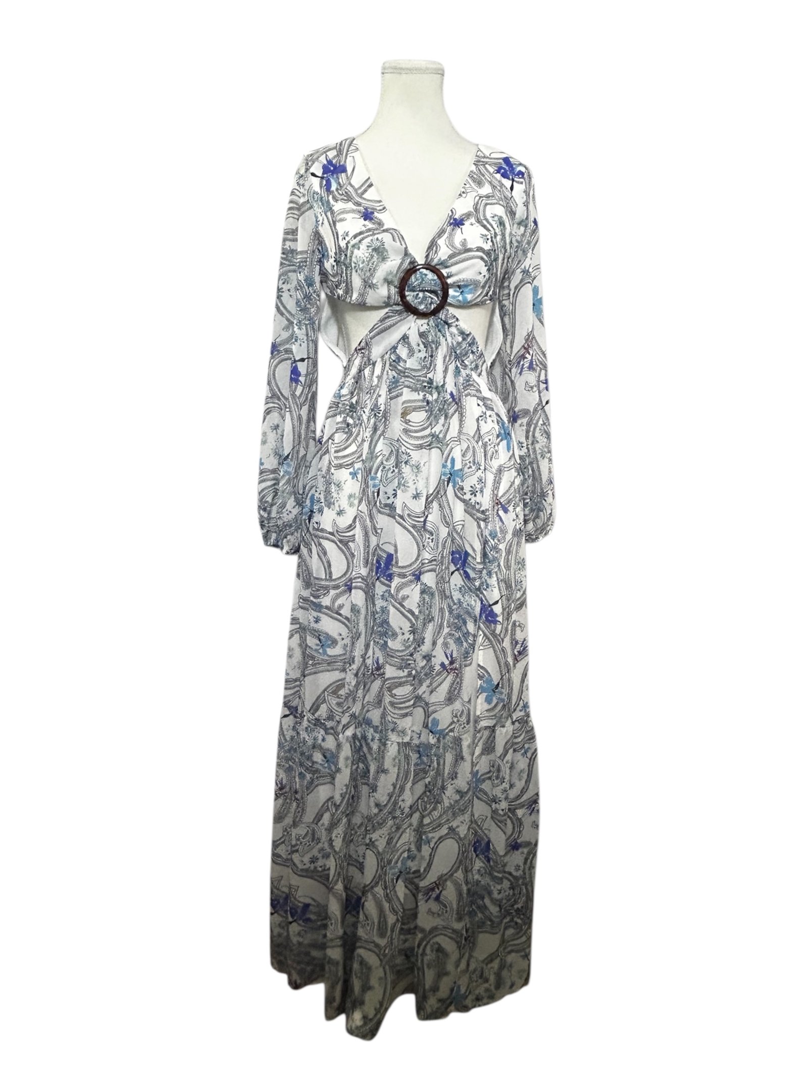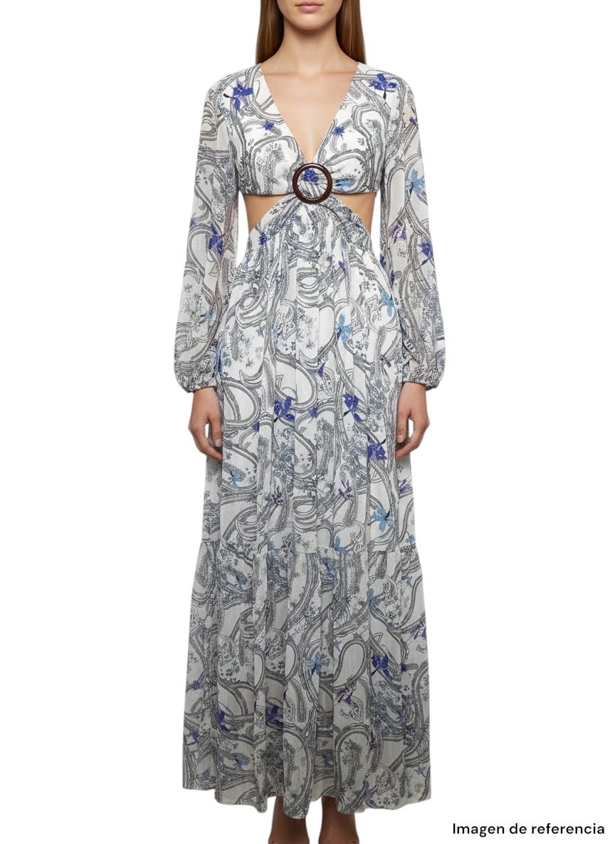 Espectacular vestido largo de la marca GIFFINISETI en talla S, diseñado para destacar con un estilo bohemio y elegante. Su hermoso estampado artístico en tonos neutros con detalles en azul le da un aire sofisticado y único.