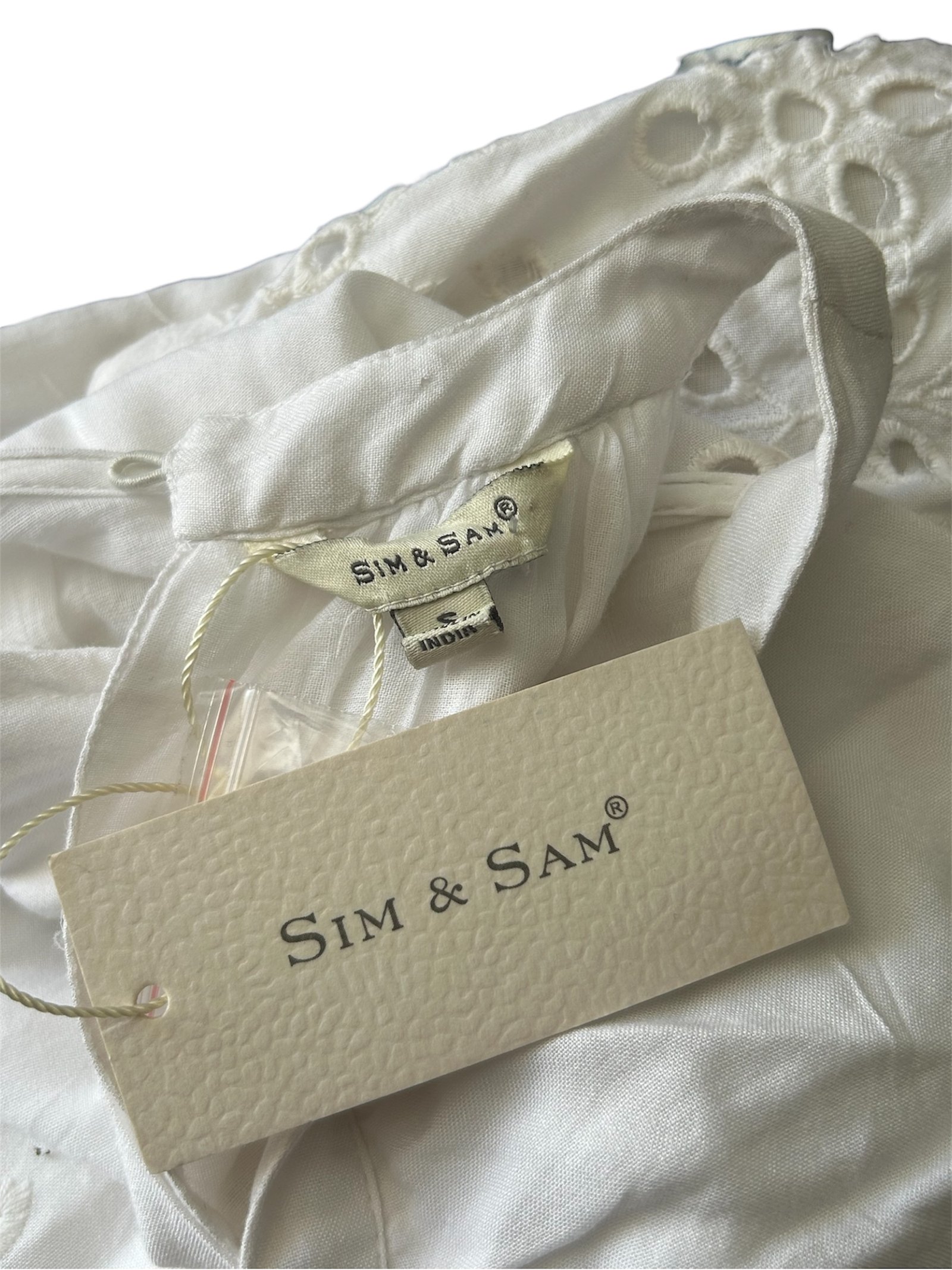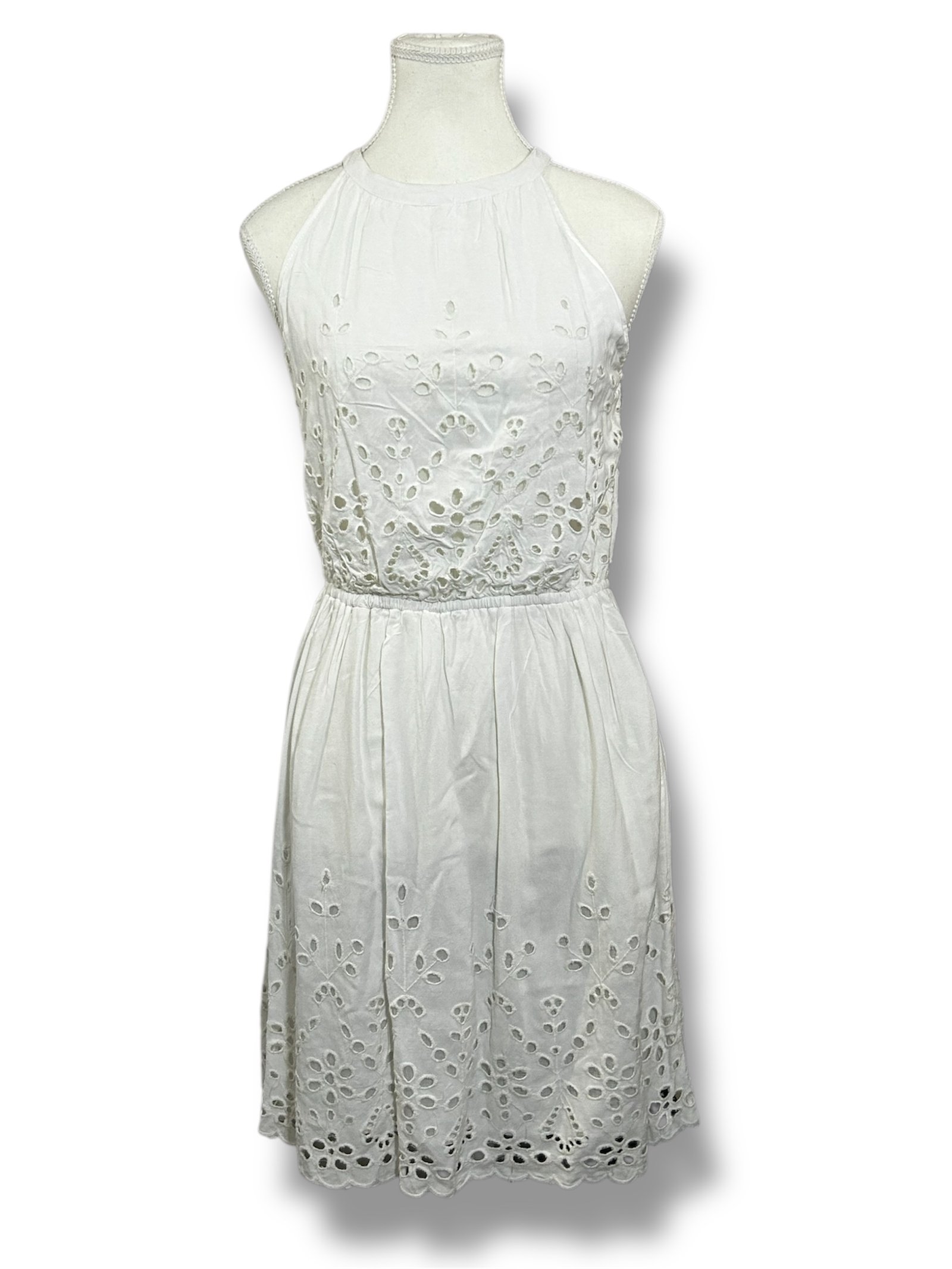 Vestido blanco sin mangas de SIM&SAM, talla S, con delicado bordado calado. Diseño fresco y femenino ideal para eventos de día o looks casuales elegantes.