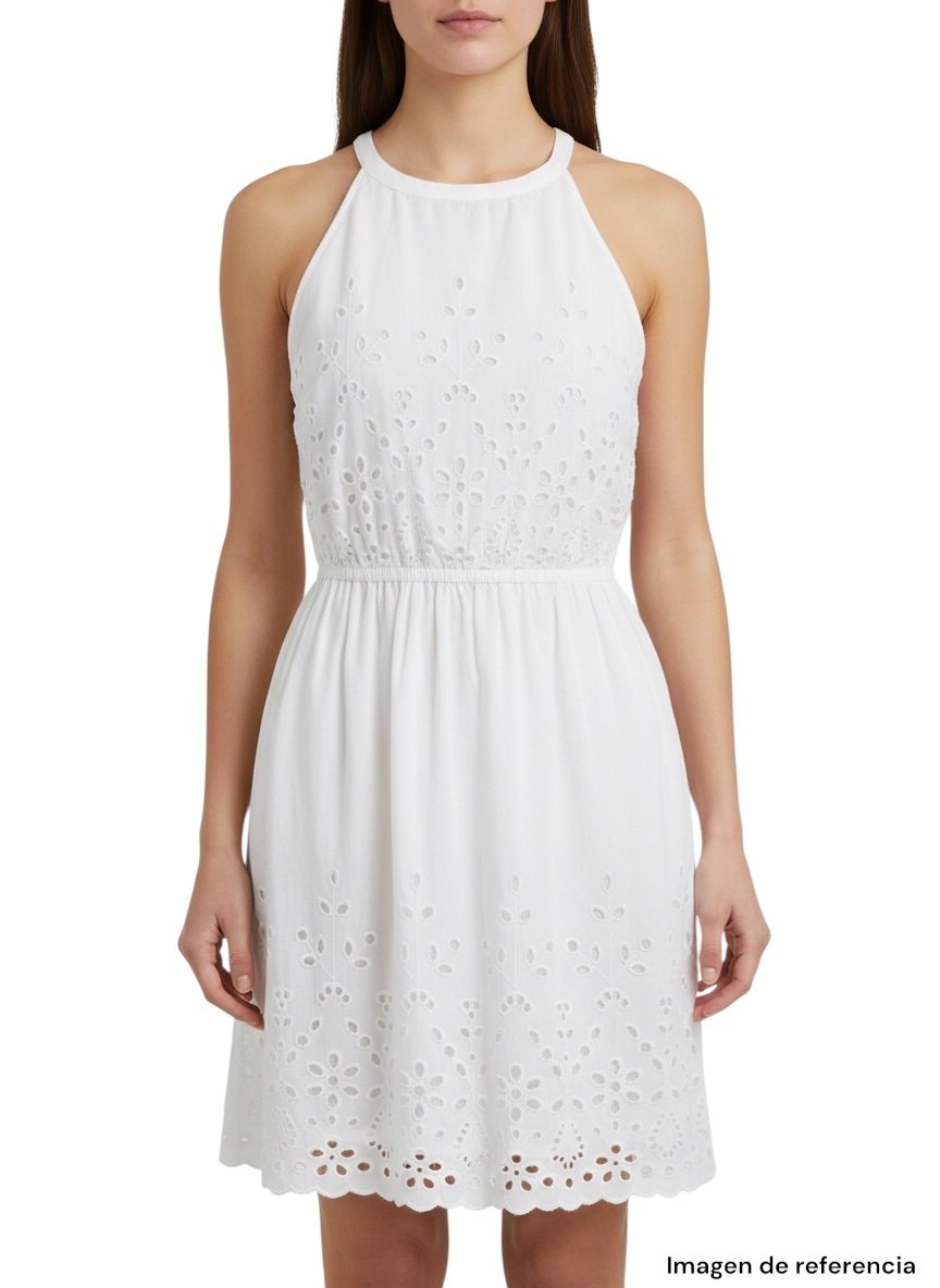 Hermoso vestido blanco de la marca SIM&SAM en talla S, diseñado con un estilo fresco, romántico y muy femenino. Su tela presenta un delicado bordado calado tipo eyelet, que aporta textura y un toque elegante sin perder ligereza.