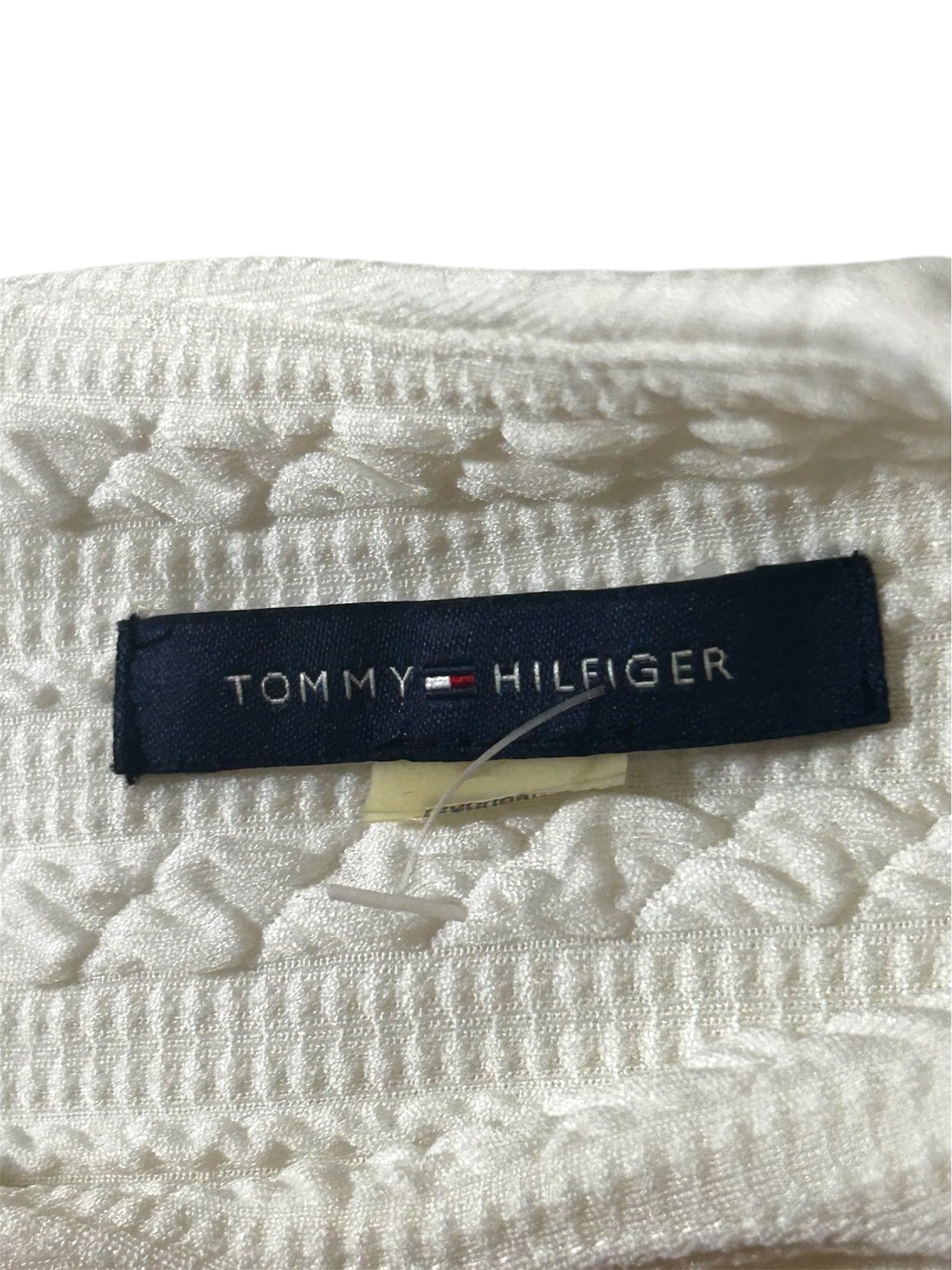 legante vestido de Tommy Hilfiger en color crema con delicada textura y falda ligeramente acampanada que aporta movimiento y estilo. Su diseño clásico y sofisticado lo convierte en una opción ideal para ocasiones especiales o looks elegantes de día. Talla S.