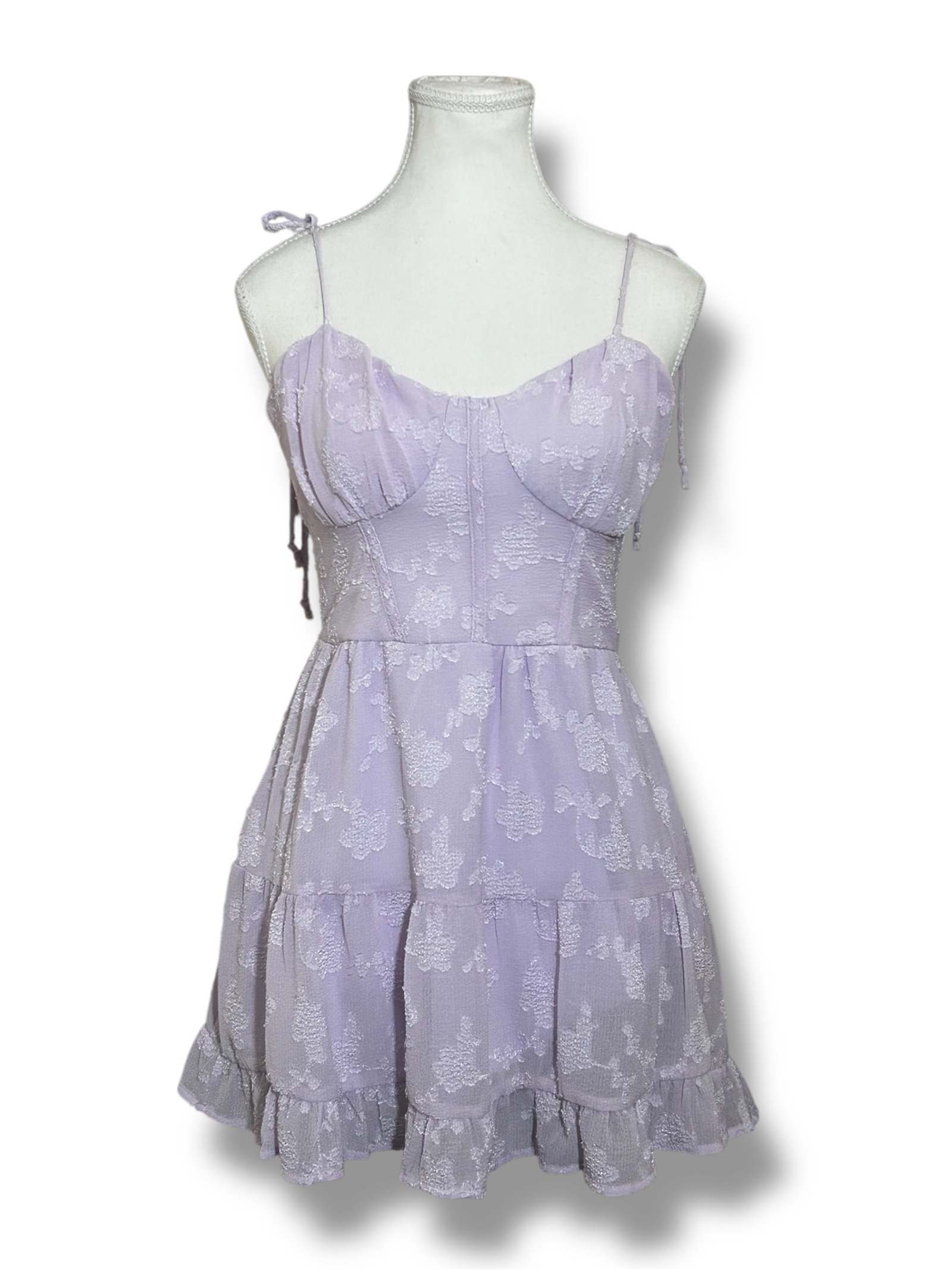 En un encantador tono lila suave, este vestido destaca por su estampado floral sutil, que le da un aire romántico y fresco. Cuenta con un diseño de tirantes delgados con lazo ajustable, permitiendo adaptarlo perfectamente a tu medida.
