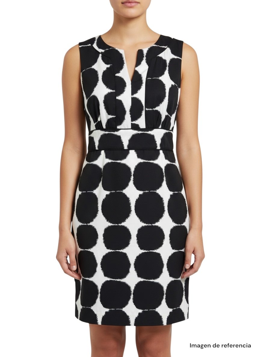 Su diseño en blanco con estampado negro tipo abstracto/puntos grandes crea un contraste elegante que nunca pasa de moda.
