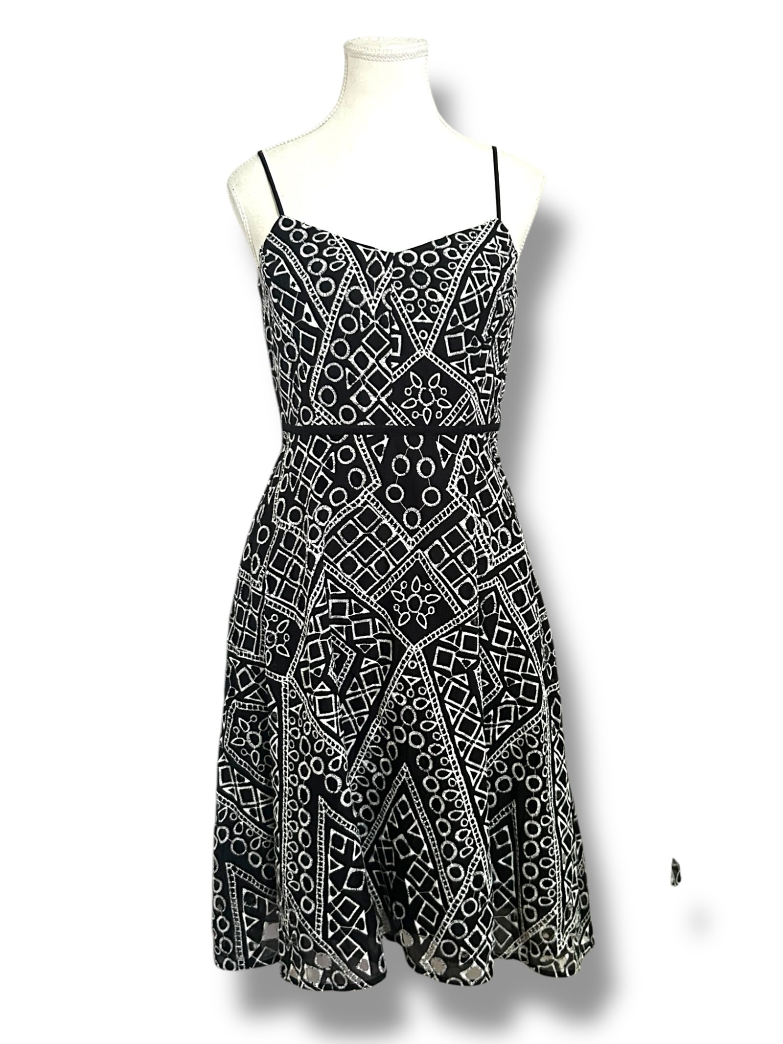 Vestido Banana Republic talla 2 en blanco y negro con diseño geométrico. Elegante, femenino y perfecto para ocasiones especiales.