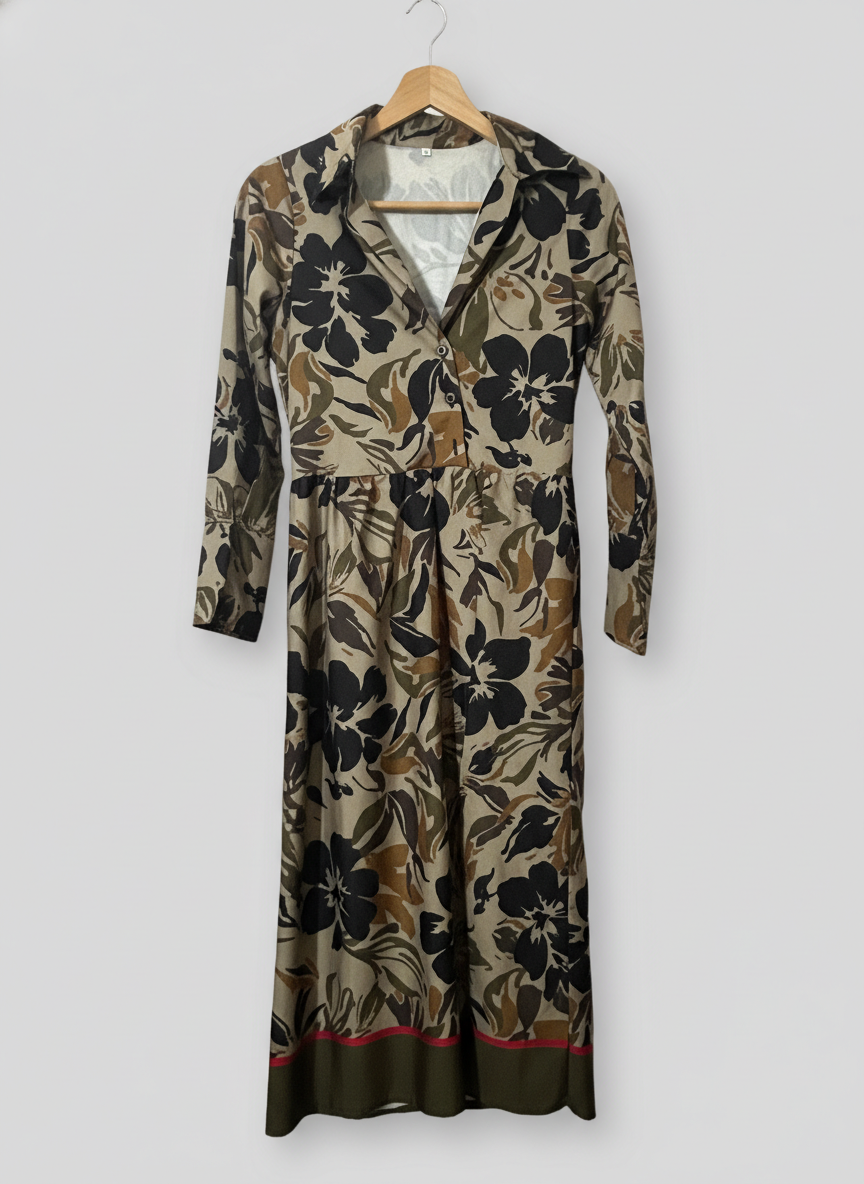 Hermoso vestido talla S con un diseño floral en tonos tierra que combina elegancia y estilo bohemio de forma perfecta.